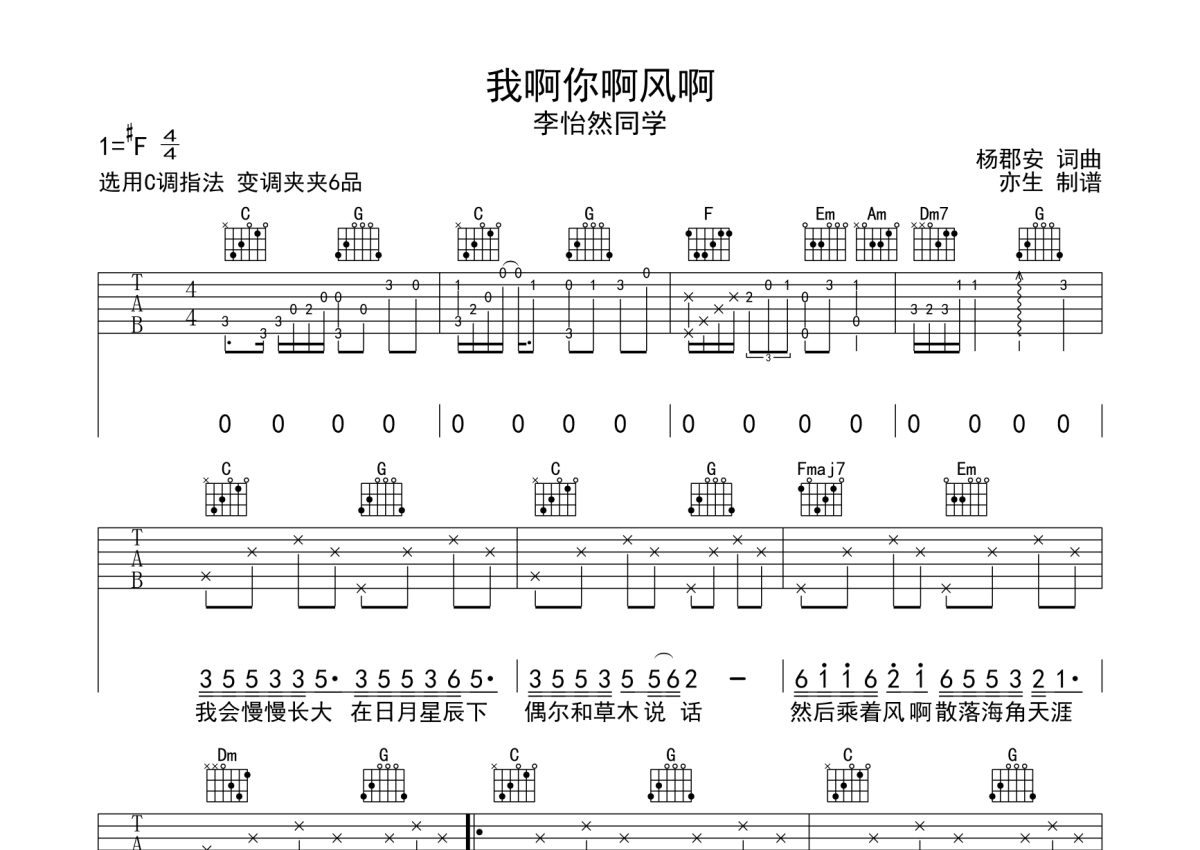 李怡然同学《我啊你啊风啊》吉他谱 - C调弹唱六线谱