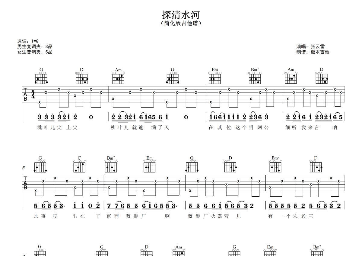 《探清水河》是晓月老板张云雷演唱的一首歌曲,拍号为4/4拍,歌曲原调为Bb调,但由于原调指法比较难,为了方便弹奏,本吉他谱采用的是G调指法编配,变调夹3品弹奏即为原调,当然也可以根据自己的音域改变变调夹位置,或者通过改变和弦调性,以方便自己弹奏,这份吉他谱共有三张高清图谱,图谱由 @糖木吉他 编配上传,图谱使用六线谱编配,包含吉他和弦指法、简谱以及歌词部分,使用这份探清水河吉他谱,可以让你更加方便地掌握这首歌曲的弹唱技巧,快来尝试吧。对新手超友好的简化版吉他弹唱谱《探清水河》张云雷版 谱曲对应视频示范以及音频示范都可在抖音搜索(糖木吉他)观看 想要更多吉他谱,可在抖音和小红书搜索关注“糖木吉他” 或者添加老师微信“Tangmu2867 ”来获取更多简单弹唱的吉他谱和弹唱视频。