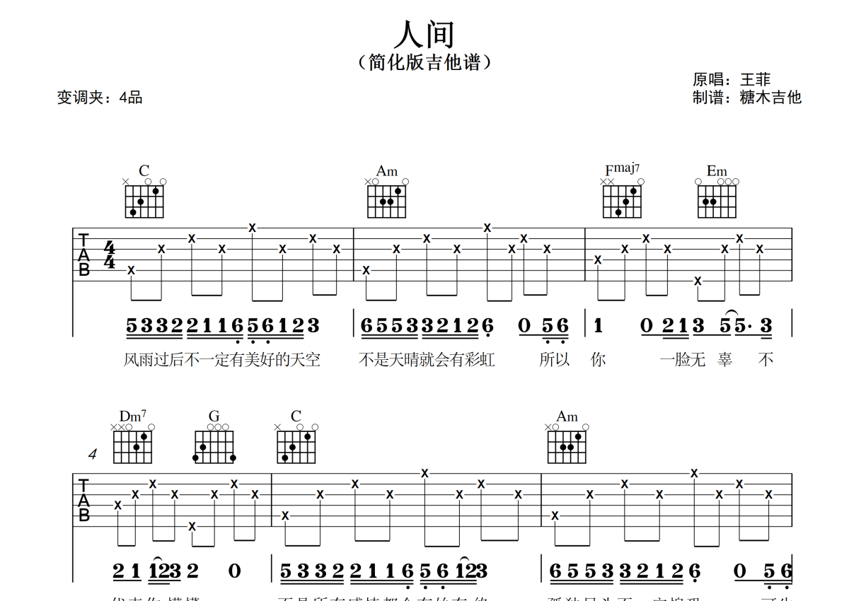 《人间》是王菲演唱的一首歌曲,拍号为4/4拍,歌曲原调为E调,但由于原调指法比较难,为了方便弹奏,本吉他谱采用的是C调指法编配,变调夹4品弹奏即为原调,当然也可以根据自己的音域改变变调夹位置,或者通过改变和弦调性,以方便自己弹奏,这份吉他谱共有两张高清图谱,图谱由 @糖木吉他 编配上传,图谱使用六线谱编配,包含吉他和弦指法、简谱以及歌词部分,使用这份人间吉他谱,可以让你更加方便地掌握这首歌曲的弹唱技巧,快来尝试吧。对新手超友好的简化版吉他弹唱谱《人间》王菲版 谱曲对应视频示范以及音频示范都可在抖音搜索(糖木吉他)观看 想要更多吉他谱,可在抖音和小红书搜索关注“糖木吉他” 或者添加老师微信“Tangmu2867 ”来获取更多简单弹唱的吉他谱和弹唱视频。