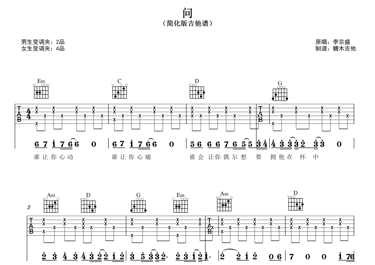 《问》是林忆莲演唱的一首歌曲,拍号为4/4拍,歌曲原调为A调,但由于原调指法比较难,为了方便弹奏,本吉他谱采用的是G调指法编配,变调夹2品弹奏即为原调,当然也可以根据自己的音域改变变调夹位置,或者通过改变和弦调性,以方便自己弹奏,这份吉他谱共有两张高清图谱,图谱由 @糖木吉他 编配上传,图谱使用六线谱编配,包含吉他和弦指法、简谱以及歌词部分,使用这份问吉他谱,可以让你更加方便地掌握这首歌曲的弹唱技巧,快来尝试吧。对新手超友好的简化版吉他弹唱谱《问》林忆莲版 谱曲对应视频示范以及音频示范都可在抖音搜索(糖木吉他)观看 想要更多吉他谱,可在抖音和小红书搜索关注“糖木吉他” 或者添加老师微信“Tangmu2867 ”来获取更多简单弹唱的吉他谱和弹唱视频。