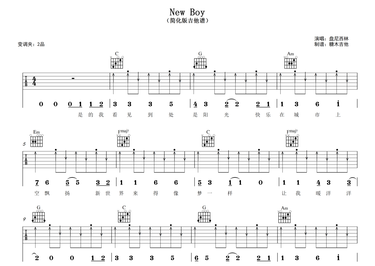 《New Boy》是盘尼西林演唱的一首歌曲,拍号为4/4拍,歌曲原调为D调,但由于原调指法比较难,为了方便弹奏,本吉他谱采用的是C调指法编配,变调夹2品弹奏即为原调,当然也可以根据自己的音域改变变调夹位置,或者通过改变和弦调性,以方便自己弹奏,这份吉他谱共有四张高清图谱,图谱由 @糖木吉他 编配上传,图谱使用六线谱编配,包含吉他和弦指法、简谱以及歌词部分,使用这份New Boy吉他谱,可以让你更加方便地掌握这首歌曲的弹唱技巧,快来尝试吧。对新手超友好的简化版吉他弹唱谱《New Boy》盘尼西林版 谱曲对应视频示范以及音频示范都可在抖音搜索(糖木吉他)观看 想要更多吉他谱,可在抖音和小红书搜索关注“糖木吉他” 或者添加老师微信“Tangmu2867 ”来获取更多简单弹唱的吉他谱和弹唱视频New Boy。