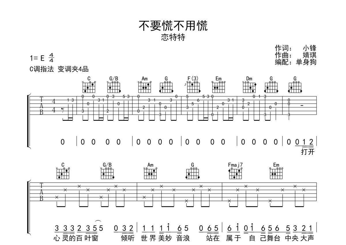 《不要慌不用慌》是恋特特演唱的一首歌曲,拍号为4/4拍,歌曲原调为E调,但由于原调指法比较难,为了方便弹奏,本吉他谱采用的是C调指法编配,变调夹4品弹奏即为原调,当然也可以根据自己的音域改变变调夹位置,或者通过改变和弦调性,以方便自己弹奏,这份吉他谱共有三张高清图谱,图谱由 @单身狗 编配上传,图谱使用六线谱编配,包含吉他和弦指法、简谱以及歌词部分,使用这份不要慌不用慌吉他谱,可以让你更加方便地掌握这首歌曲的弹唱技巧,快来尝试吧。