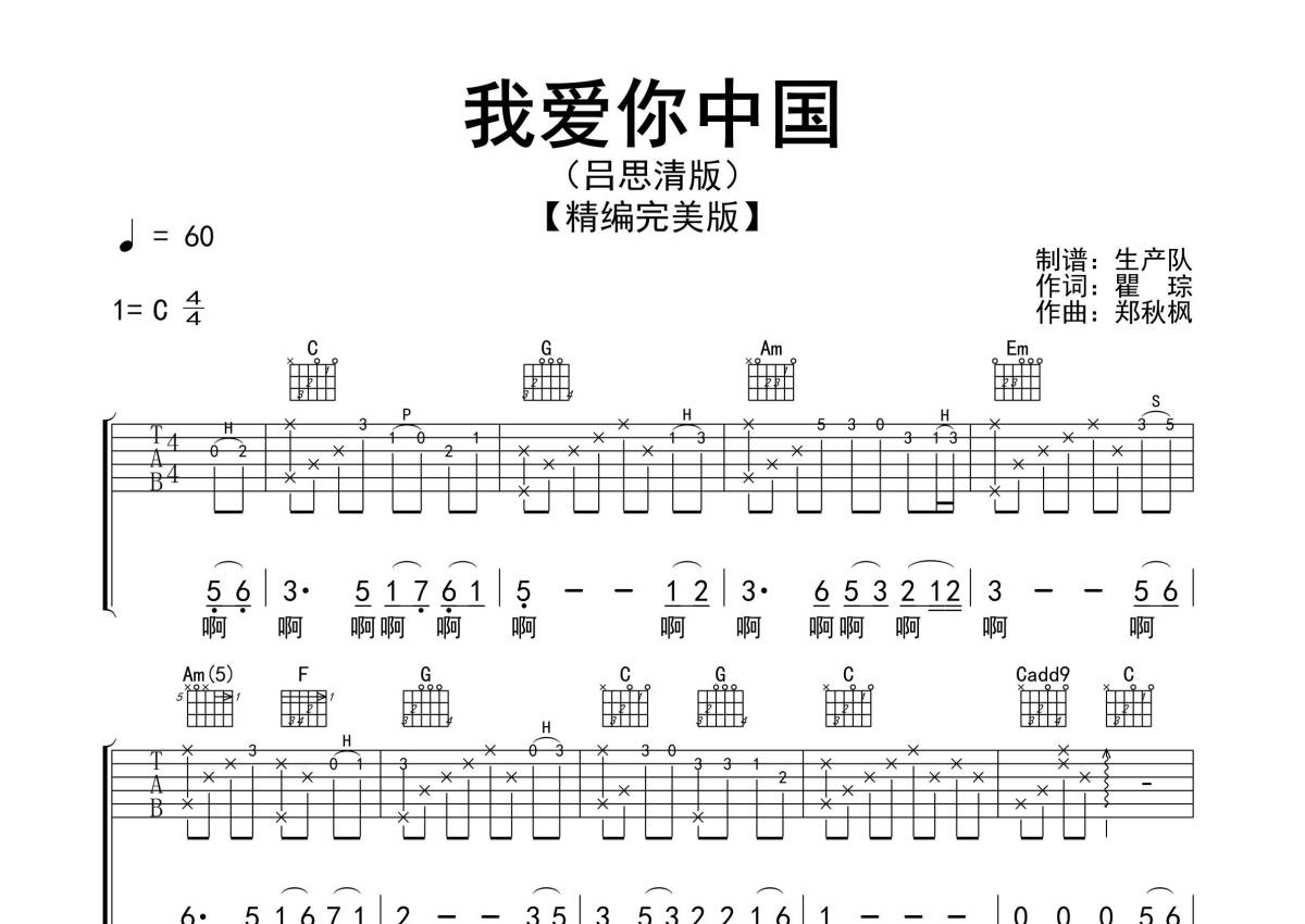 《我爱你中国》是吕思清演唱的一首歌曲,精编完美版,拍号为4/4拍,歌曲速度为每分钟60拍,歌曲原调为C调,本吉他谱采用的是C调指法编配,演奏时不需要使用变调夹即为原调,这份吉他谱共有三张高清图谱,图谱由 @生产队 编配上传,图谱使用六线谱编配,包含吉他和弦指法、简谱以及歌词部分,使用这份我爱你中国吉他谱,可以让你更加方便地掌握这首歌曲的弹唱技巧,快来尝试吧。《我爱你,中国》是瞿琮作词,郑秋枫作曲,叶佩英原唱的一首爱国主义歌曲,是1979年电影《海外赤子》的插曲。本吉他谱是根据吕思清演奏的小提琴版编配的吉他民谣弹唱版,精准的前奏、间奏、尾奏及SOLO编配,热血沸腾的旋律,致敬经典!。
