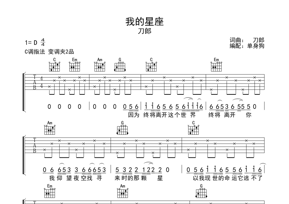 刀郎《我的星座》吉他谱 - C调弹唱六线谱