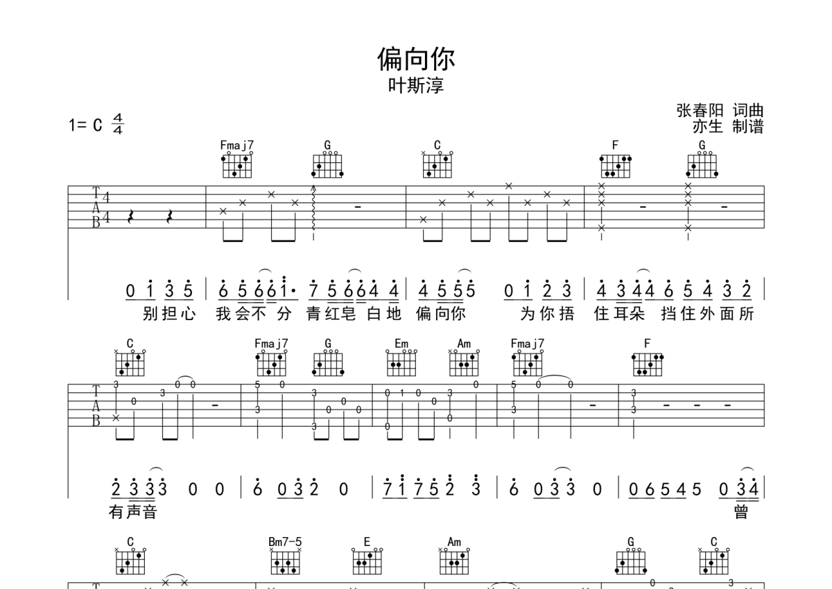 叶斯淳《偏向你》吉他谱 - C调弹唱六线谱