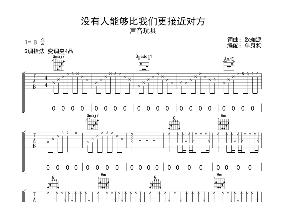 《没有人能够比我们更接近对方》是声音玩具演唱的一首歌曲,拍号为4/4拍,歌曲原调为B调,但由于原调指法比较难,为了方便弹奏,本吉他谱采用的是G调指法编配,变调夹4品弹奏即为原调,当然也可以根据自己的音域改变变调夹位置,或者通过改变和弦调性,以方便自己弹奏,这份吉他谱共有四张高清图谱,图谱由 @单身狗 编配上传,图谱使用六线谱编配,包含吉他和弦指法、简谱以及歌词部分,使用这份没有人能够比我们更接近对方吉他谱,可以让你更加方便地掌握这首歌曲的弹唱技巧,快来尝试吧。