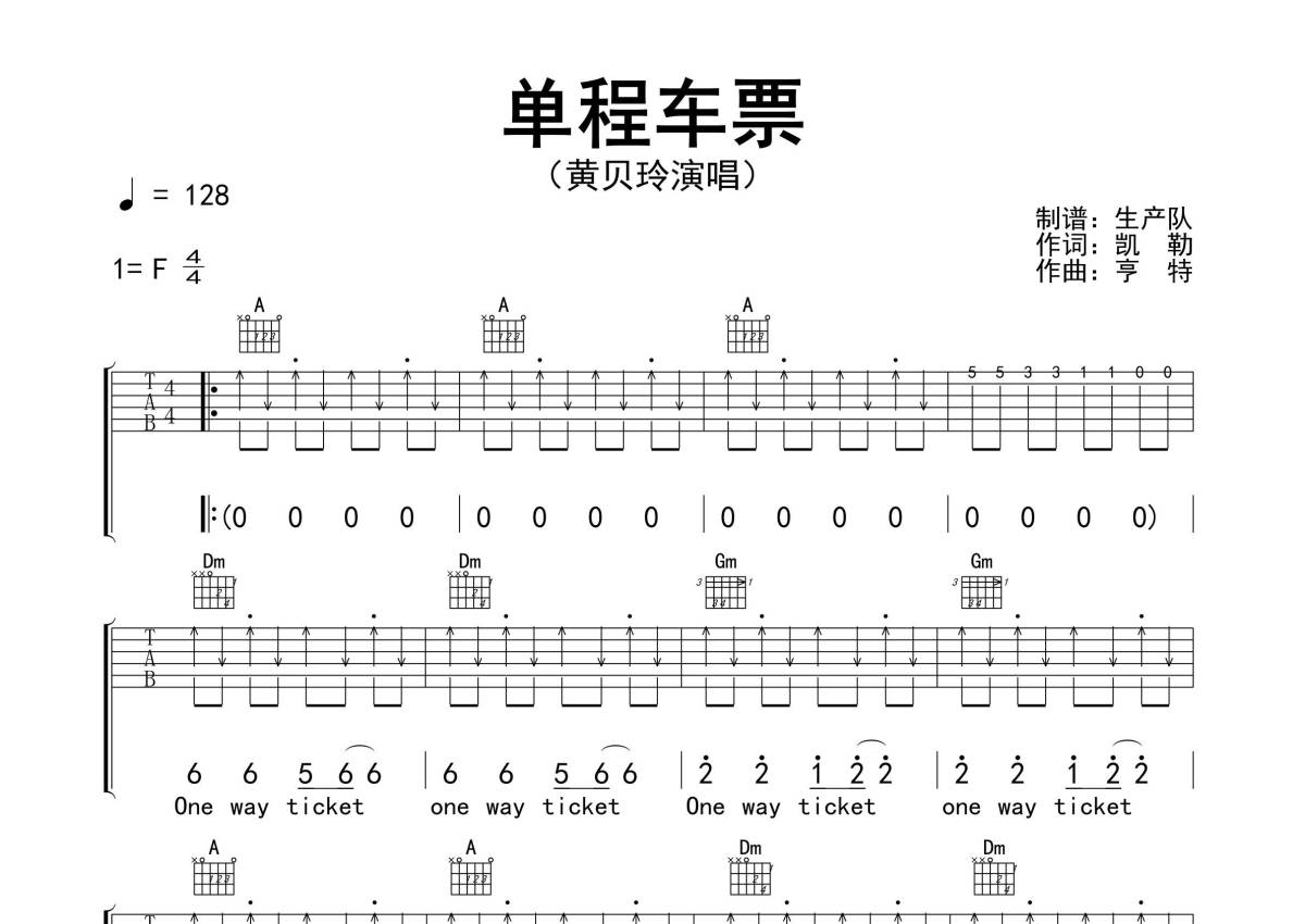 《单程车票》是黄贝玲演唱的一首歌曲,精编扫弦版,拍号为4/4拍,歌曲速度为每分钟128拍,歌曲原调为F调,但由于原调指法比较难,为了方便弹奏,本吉他谱采用的是F调指法编配,演奏时不需要使用变调夹即为原调,这份吉他谱共有三张高清图谱,图谱由 @生产队 编配上传,图谱使用六线谱编配,包含吉他和弦指法、简谱以及歌词部分,使用这份单程车票吉他谱,可以让你更加方便地掌握这首歌曲的弹唱技巧,快来尝试吧。《单程车票》是由黄贝玲演唱的一首歌曲。本吉他谱根据原版F调指法编配,扫弦切音节奏,效果非常好,一首动感十足的歌曲,摇摆起来吧!。