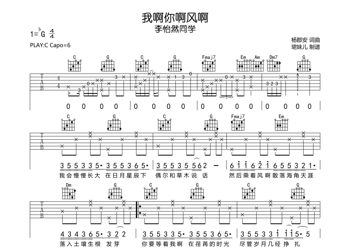 李怡然同学《我啊你啊风啊》吉他谱 - C调弹唱六线谱