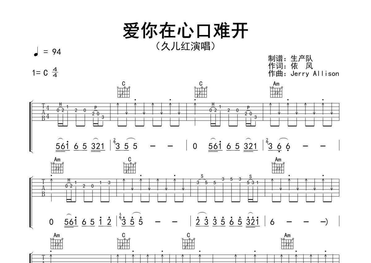 《爱你在心口难开》是久儿红演唱的一首歌曲,精编扫弦版,拍号为4/4拍,歌曲速度为每分钟94拍,歌曲原调为C调,本吉他谱采用的是C调指法编配,演奏时不需要使用变调夹即为原调,这份吉他谱共有三张高清图谱,图谱由 @生产队 编配上传,图谱使用六线谱编配,包含吉他和弦指法、简谱以及歌词部分,使用这份爱你在心口难开吉他谱,可以让你更加方便地掌握这首歌曲的弹唱技巧,快来尝试吧。本吉他谱是根据久儿红翻唱的《爱你在心口难开》原版C调指法编配,完整的前奏、间奏、尾奏及SOLO编配,扫弦切音节奏,一首经典的怀旧歌曲,值得回味!。