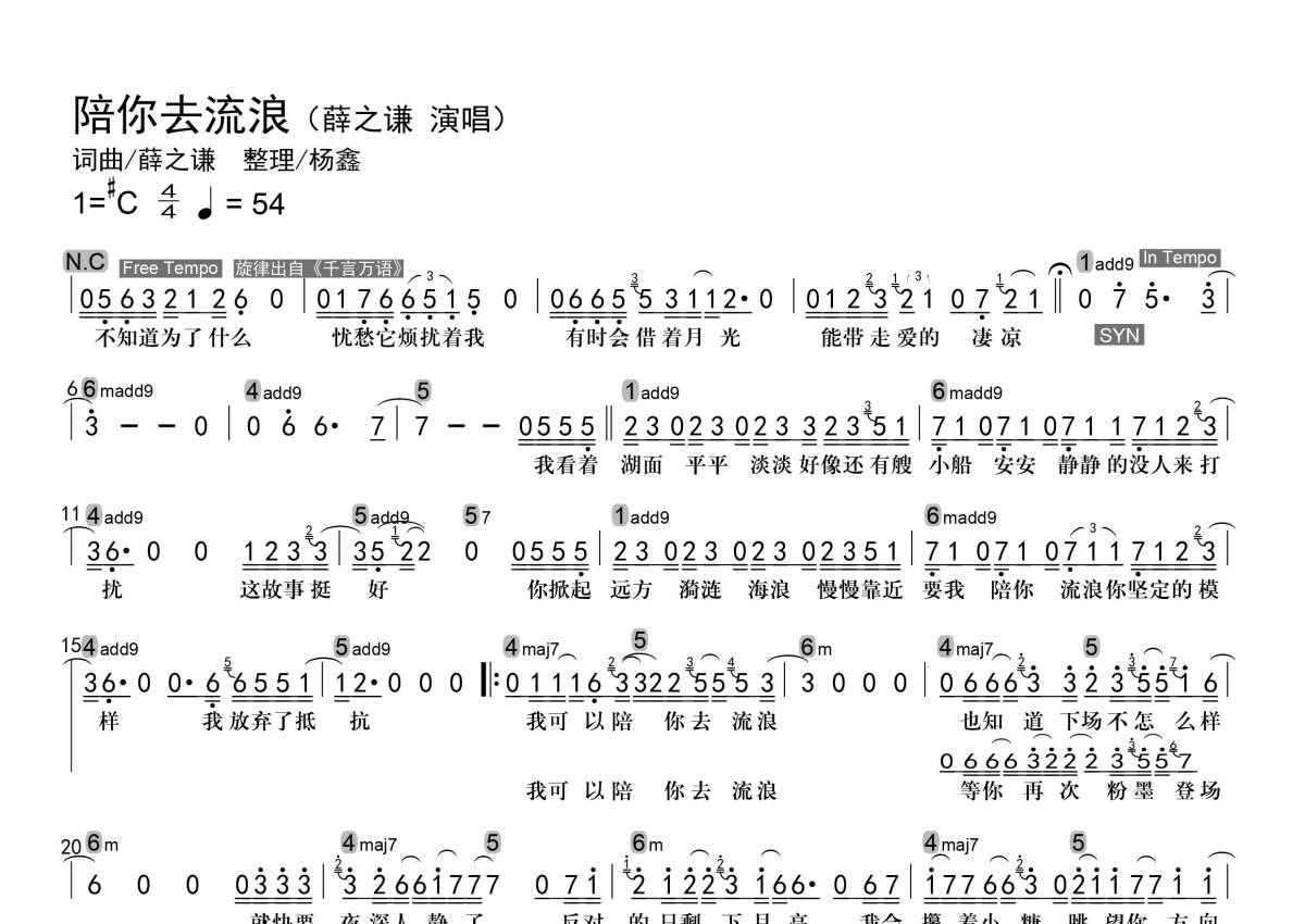 《陪你去流浪》是薛之谦演唱的一首歌曲,级数和弦标记,拍号为4/4拍,歌曲速度为每分钟54拍,这份简谱共有一张高清图谱,图谱由 @老杨教吉他 编配上传【歌曲信息】Key:#C Tempo:4/4 每分钟54拍。 【整理信息】按原曲完整整理。 【和弦标记】数字级数。 【和弦难度】大、小三和弦,大、属七和弦, 加九和弦,挂留和弦。