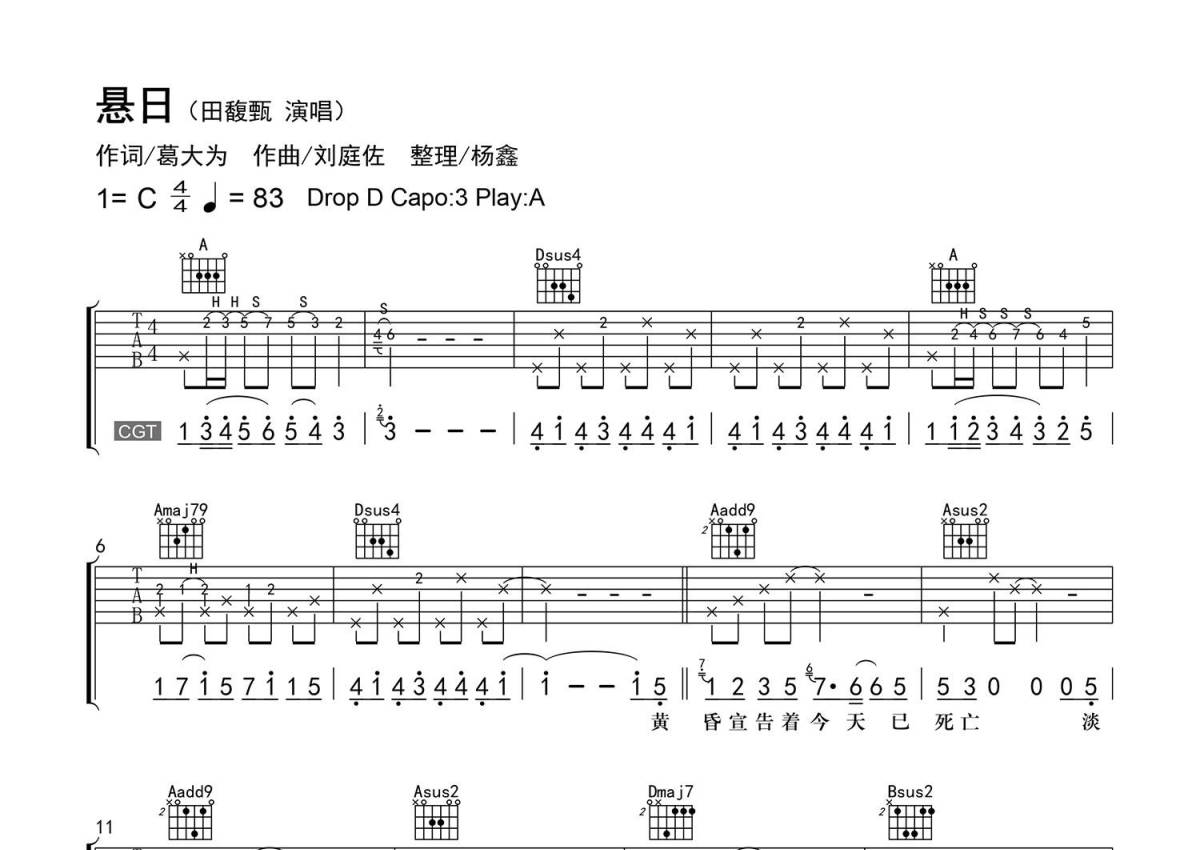《悬日》是田馥甄演唱的一首歌曲,精编弹唱,拍号为4/4拍,歌曲速度为每分钟83拍,歌曲原调为C调,本吉他谱采用的是A调指法编配,变调夹3品弹奏即为原调,当然也可以根据自己的音域改变变调夹位置,或者通过改变和弦调性,以方便自己弹奏,这份吉他谱共有四张高清图谱,图谱由 @老杨教吉他 编配上传,图谱使用六线谱编配,包含吉他和弦指法、简谱以及歌词部分,使用这份悬日吉他谱,可以让你更加方便地掌握这首歌曲的弹唱技巧,快来尝试吧。【调弦】Drop D(6-1:D A D G B E)。 【编配情况】根据原曲精细整理。 【和弦难度】有和弦的不常用按法、大跨度和弦、不常用和弦、大横按。 【节奏难度】最小时值16分音符,有附点、切分、演奏技巧。 【难点】节奏的变化/特殊和弦的按法/常用技巧的连用。 【技巧说明】H为【击弦】、S为【滑音】、P为【勾弦】。
