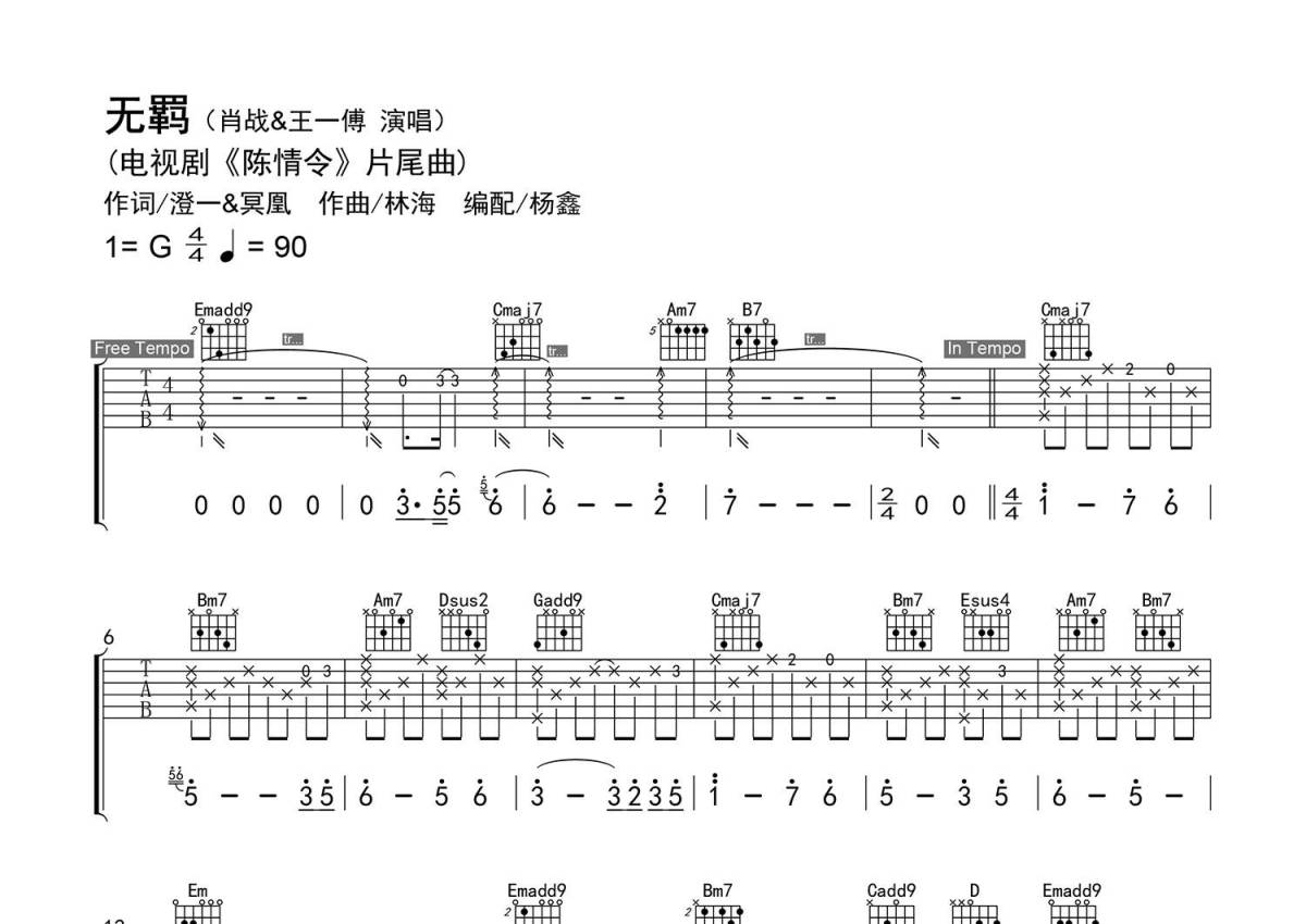 《无羁》是肖战vs王一博演唱的一首歌曲,精编弹唱,拍号为4/4拍,歌曲速度为每分钟90拍,歌曲原调为G调,本吉他谱采用的是G调指法编配,演奏时不需要使用变调夹即为原调,这份吉他谱共有三张高清图谱,图谱由 @老杨教吉他 编配上传,图谱使用六线谱编配,包含吉他和弦指法、简谱以及歌词部分,使用这份无羁吉他谱,可以让你更加方便地掌握这首歌曲的弹唱技巧,快来尝试吧。【编配情况】根据原曲精细整理。 【和弦难度】有和弦的不常用按法、大跨度和弦、不常用和弦、大横按。 【节奏难度】最小时值32分音符,有附点、切分、演奏技巧。 【难点】震音、哑音技巧及节奏的变化。 【技巧说明】拨弦后带双斜杠(或标注“tr”)为【震音】;“+”为【敲板】(连续三个三弦拨弦带+为无名指、中指、食指指甲背敲击琴码下后方面板;二弦拨弦带+为拇指外侧敲击琴码下后方面板;六弦拨弦带+为无名指与中指同时敲击琴箱下后方侧板;PS:敲板为过渡链接,可以忽略);扫弦带空心圈为【哑音】;Harm为【自然泛音】。