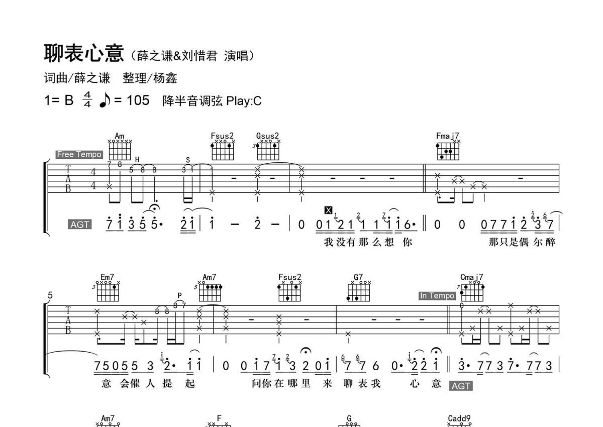 《聊表心意》是薛之谦/刘惜君演唱的一首歌曲,精编弹唱,拍号为4/4拍,歌曲速度为每分钟50拍,歌曲原调为B调,但由于原调指法比较难,为了方便弹奏,本吉他谱采用的是C调指法编配,降半音调弦弹奏即为原调,当然也可以根据自己的音域决定是否调弦,这份吉他谱共有四张高清图谱,图谱由 @老杨教吉他 编配上传,图谱使用六线谱编配,包含吉他和弦指法、简谱以及歌词部分,使用这份聊表心意吉他谱,可以让你更加方便地掌握这首歌曲的弹唱技巧,快来尝试吧。【编配情况】根据原曲精细整理。 【和弦难度】有和弦的不常用按法、大跨度和弦、不常用和弦、大横按。 【节奏难度】最小时值16分音符,有附点、切分、三连音、演奏技巧。 【难点】不常用和弦的按法。 【技巧说明】H为【击弦】、P为【勾弦】、S为【滑音】;Harm为【自然泛音】。