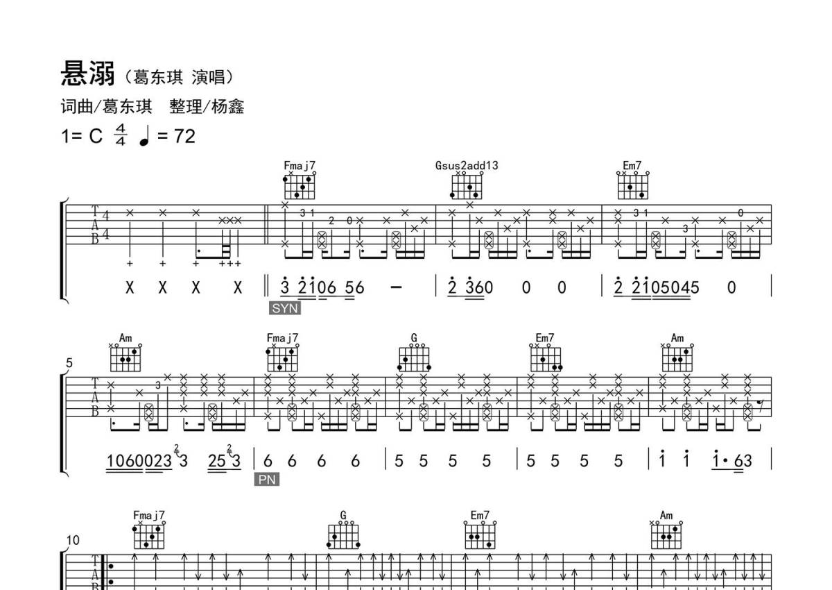 《悬溺》是葛东琪演唱的一首歌曲,精编弹唱,拍号为4/4拍,歌曲速度为每分钟72拍,歌曲原调为C调,本吉他谱采用的是C调指法编配,演奏时不需要使用变调夹即为原调,这份吉他谱共有两张高清图谱,图谱由 @老杨教吉他 编配上传,图谱使用六线谱编配,包含吉他和弦指法、简谱以及歌词部分,使用这份悬溺吉他谱,可以让你更加方便地掌握这首歌曲的弹唱技巧,快来尝试吧。【编配情况】根据原曲精细整理。 【和弦难度】拇指按弦、少数不常用按法。 【节奏难度】最小时值32分音符,含附点、切分节奏;含拍弦及敲板等技巧。 【难点】前奏、间奏及敲板技巧。 【技巧说明】“+”为【敲板】(2弦拨弦带“+”为拇指敲击琴码下后方面板;连续3个3弦拨弦带“+”为无名指、中指、食指指背依次敲击琴码下后方面板;偏低音扫弦带“+”为掌根敲击6弦上方面板,同时用中指与无名指“磕”弦;偏高音扫弦带“+”为小指敲击1弦下方面板,同时用中指与无名指“磕”弦);拨弦带框为【拍弦】(拍弦上还有音的为拇指拍弦,同时用中指与无名指“磕”弦);空心圈为【哑音】;拨弦后带斜杠为【无尾滑音】。