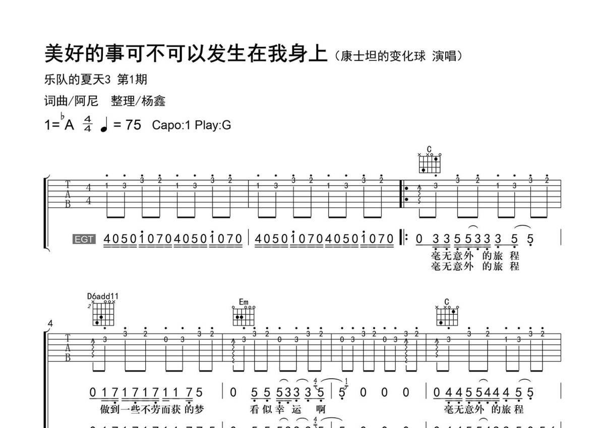 《美好的事可不可以发生在我身上(Live)》是康士坦的变化球演唱的一首歌曲,精编弹唱,拍号为4/4拍,歌曲速度为每分钟75拍,歌曲原调为Ab调,但由于原调指法比较难,为了方便弹奏,本吉他谱采用的是G调指法编配,变调夹1品弹奏即为原调,当然也可以根据自己的音域改变变调夹位置,或者通过改变和弦调性,以方便自己弹奏,这份吉他谱共有四张高清图谱,图谱由 @老杨教吉他 编配上传,图谱使用六线谱编配,包含吉他和弦指法、简谱以及歌词部分,使用这份美好的事可不可以发生在我身上(Live)吉他谱,可以让你更加方便地掌握这首歌曲的弹唱技巧,快来尝试吧。【编配情况】根据乐队的夏天3现场版精细整理。 【和弦难度】和弦的特殊按法,和弦中的变化音(手指的扩张与灵活度)。 【节奏难度】最小时值16分音符,含少量附点与切分节奏,含切音(断奏)技巧。 【难点】A段部分的旋律断奏弹法;和弦的按法。 【技巧说明】实心圈为【切音】(断奏);拨弦前后带斜杠为【无头无尾滑音】。注:无伴奏部分可使用琶音伴奏。