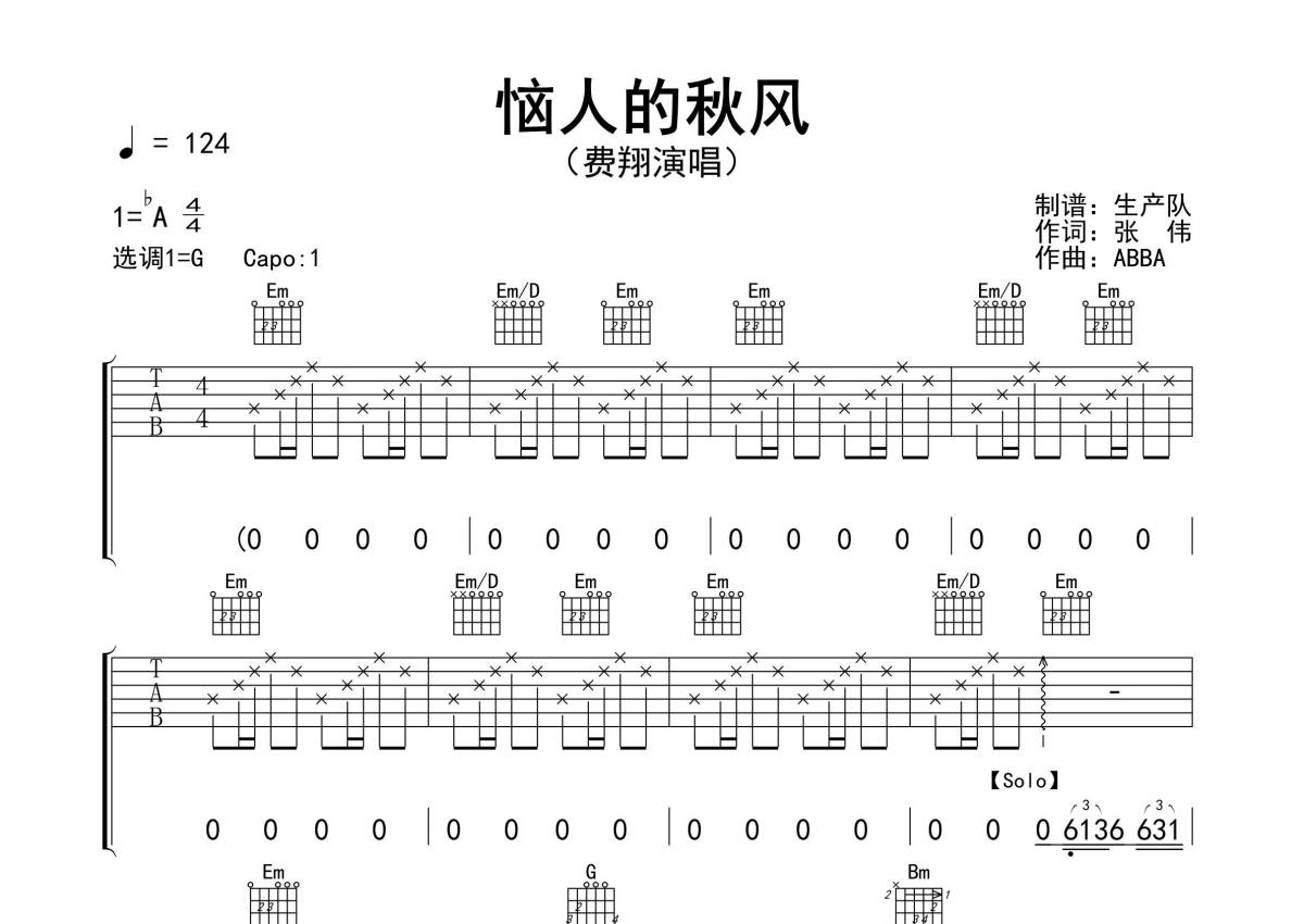 《恼人的秋风》是费翔演唱的一首歌曲,精编扫弦版,拍号为4/4拍,歌曲速度为每分钟124拍,歌曲原调为Ab调,但由于原调指法比较难,为了方便弹奏,本吉他谱采用的是G调指法编配,变调夹1品弹奏即为原调,当然也可以根据自己的音域改变变调夹位置,或者通过改变和弦调性,以方便自己弹奏,这份吉他谱共有三张高清图谱,图谱由 @生产队 编配上传,图谱使用六线谱编配,包含吉他和弦指法、简谱以及歌词部分,使用这份恼人的秋风吉他谱,可以让你更加方便地掌握这首歌曲的弹唱技巧,快来尝试吧。本吉他谱根据费翔演唱的经典歌曲《恼人的秋风》,采用G调指法原版编配,完整的前奏、间奏、尾奏,扫弦切音节奏编配,一首动感十足的经典歌曲。