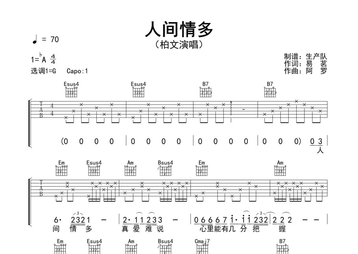 《人间情多》是柏文演唱的一首歌曲,精编完美版,拍号为4/4拍,歌曲速度为每分钟70拍,歌曲原调为Ab调,但由于原调指法比较难,为了方便弹奏,本吉他谱采用的是G调指法编配,变调夹1品弹奏即为原调,当然也可以根据自己的音域改变变调夹位置,或者通过改变和弦调性,以方便自己弹奏,这份吉他谱共有两张高清图谱,图谱由 @生产队 编配上传,图谱使用六线谱编配,包含吉他和弦指法、简谱以及歌词部分,使用这份人间情多吉他谱,可以让你更加方便地掌握这首歌曲的弹唱技巧,快来尝试吧。本吉他谱根据柏文演唱的《人间情多》原版编配,深情的歌声,韵味浓郁,回味经典老歌。完整的前奏、间奏、尾奏编配,值得推荐!。