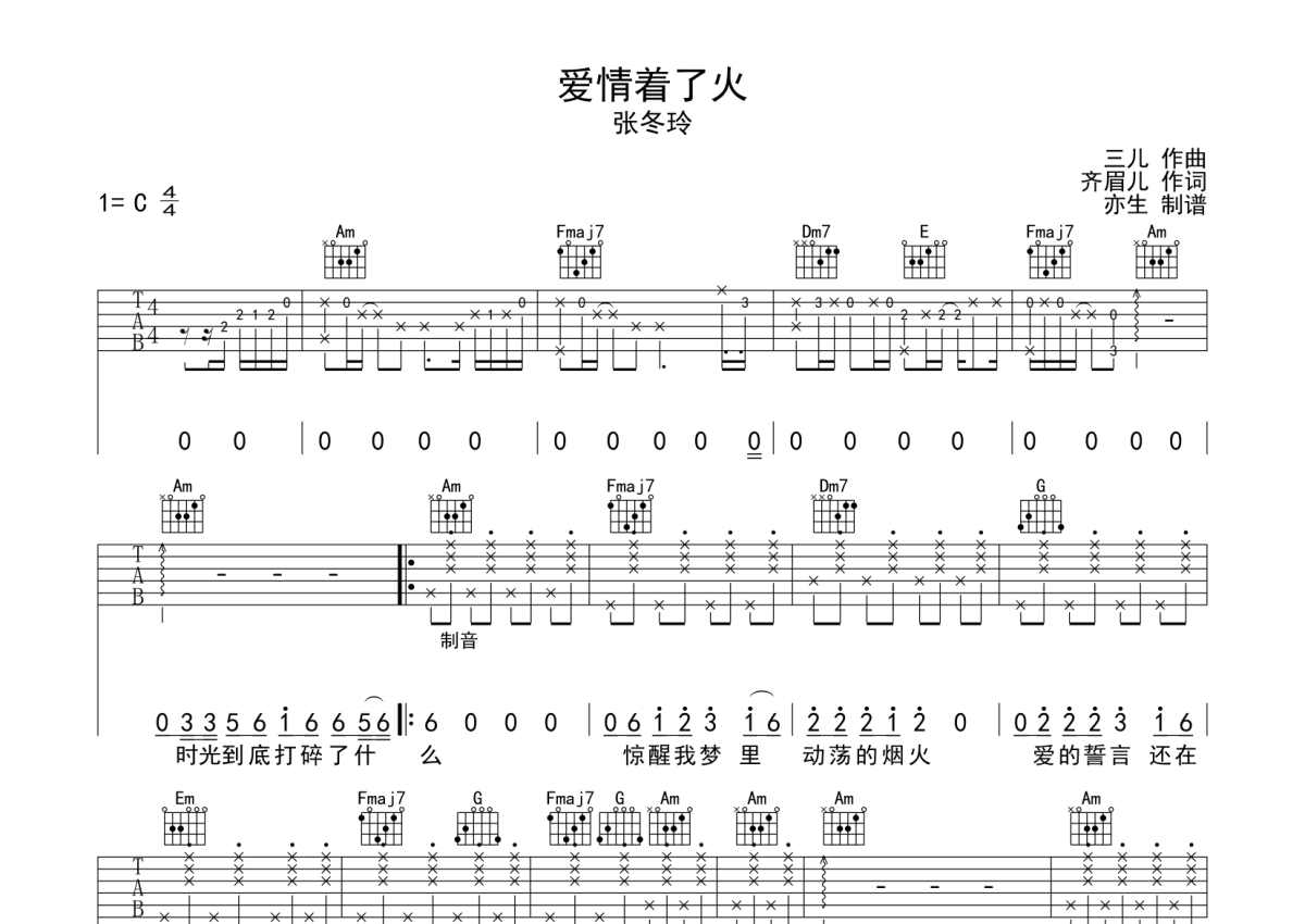 张冬玲《爱情着了火》吉他谱 - C调弹唱六线谱