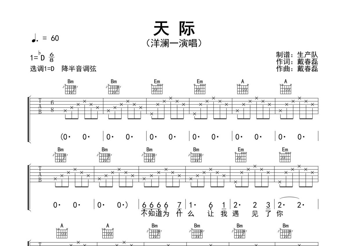《天际》是洋澜一演唱的一首歌曲,精编完美版,拍号为6/8拍,歌曲速度为每分钟60拍,歌曲原调为Db调,但由于原调指法比较难,为了方便弹奏,本吉他谱采用的是D调指法编配,降半音调弦弹奏即为原调,当然也可以根据自己的音域决定是否调弦,这份吉他谱共有三张高清图谱,图谱由 @生产队 编配上传,图谱使用六线谱编配,包含吉他和弦指法、简谱以及歌词部分,使用这份天际吉他谱,可以让你更加方便地掌握这首歌曲的弹唱技巧,快来尝试吧。本吉他谱根据洋澜一演唱的《天际》原版采用D调指法编配,完整的前奏、间奏、尾奏编配,一音不差版,一首深情的民谣歌曲,值得推荐!。