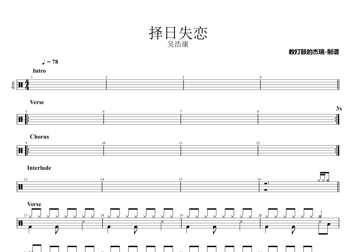 《择日失恋》是吴浩康演唱的一首歌曲,拍号为4/4拍,歌曲速度为每分钟78拍,这份鼓谱共有两张高清图谱,图谱由 @Jerry 编配上传,图谱使用五线谱编配,使用这份择日失恋架子鼓谱,你将能够轻松地敲打出这首吴浩康的择日失恋,快来尝试吧。