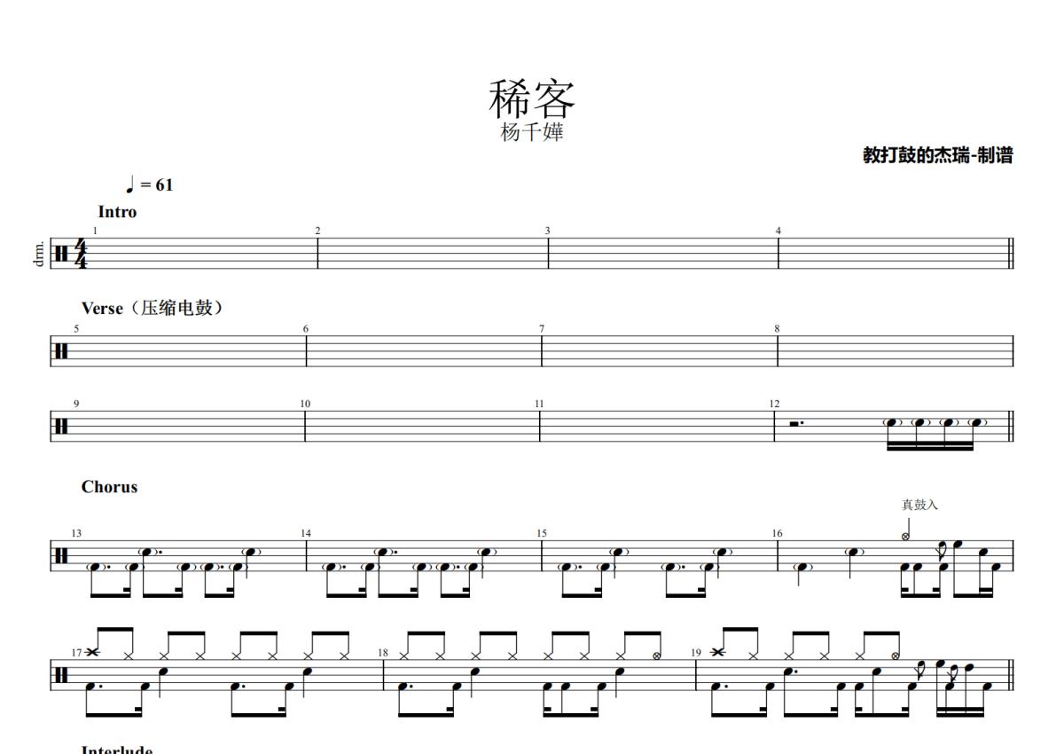 《稀客》是杨千嬅演唱的一首歌曲,拍号为4/4拍,歌曲速度为每分钟61拍,这份鼓谱共有两张高清图谱,图谱由 @Jerry 编配上传,图谱使用五线谱编配,使用这份稀客架子鼓谱,你将能够轻松地敲打出这首杨千嬅的稀客,快来尝试吧。