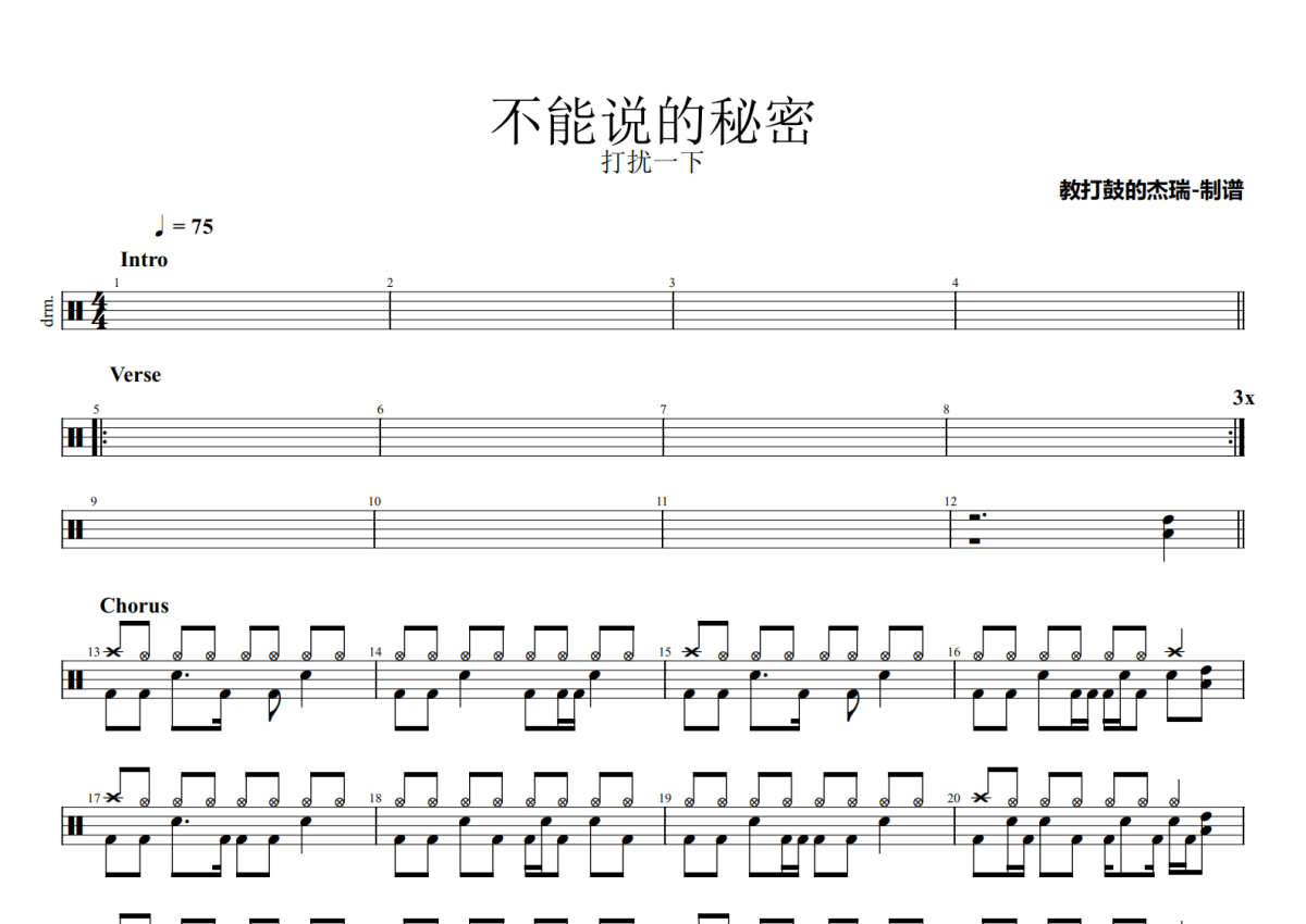 《不能说的秘密》是打扰一下乐团演唱的一首歌曲,拍号为4/4拍,歌曲速度为每分钟75拍,这份鼓谱共有两张高清图谱,图谱由 @Jerry 编配上传,图谱使用五线谱编配,使用这份不能说的秘密架子鼓谱,你将能够轻松地敲打出这首打扰一下乐团的不能说的秘密,快来尝试吧。