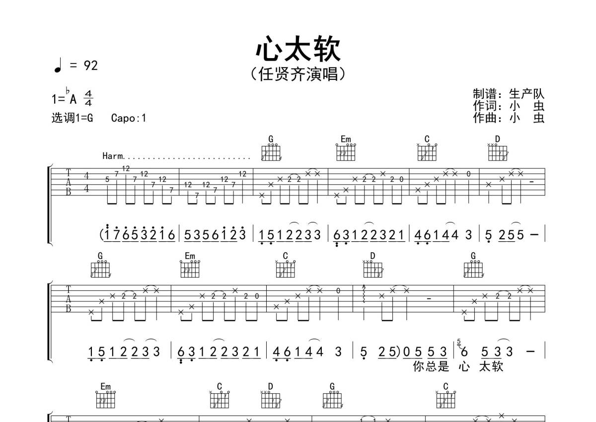 《心太软》是任贤齐演唱的一首歌曲,精编民谣版,拍号为4/4拍,歌曲速度为每分钟92拍,歌曲原调为Ab调,但由于原调指法比较难,为了方便弹奏,本吉他谱采用的是G调指法编配,变调夹1品弹奏即为原调,当然也可以根据自己的音域改变变调夹位置,或者通过改变和弦调性,以方便自己弹奏,这份吉他谱共有三张高清图谱,图谱由 @生产队 编配上传,图谱使用六线谱编配,包含吉他和弦指法、简谱以及歌词部分,使用这份心太软吉他谱,可以让你更加方便地掌握这首歌曲的弹唱技巧,快来尝试吧。《心太软》是任贤齐的成名作,1997年该歌曲获得了第二十届十大中文金曲优秀国语歌曲铜奖。本吉他谱根据原版采用G调指法编配,泛音是本曲的一大亮点!。