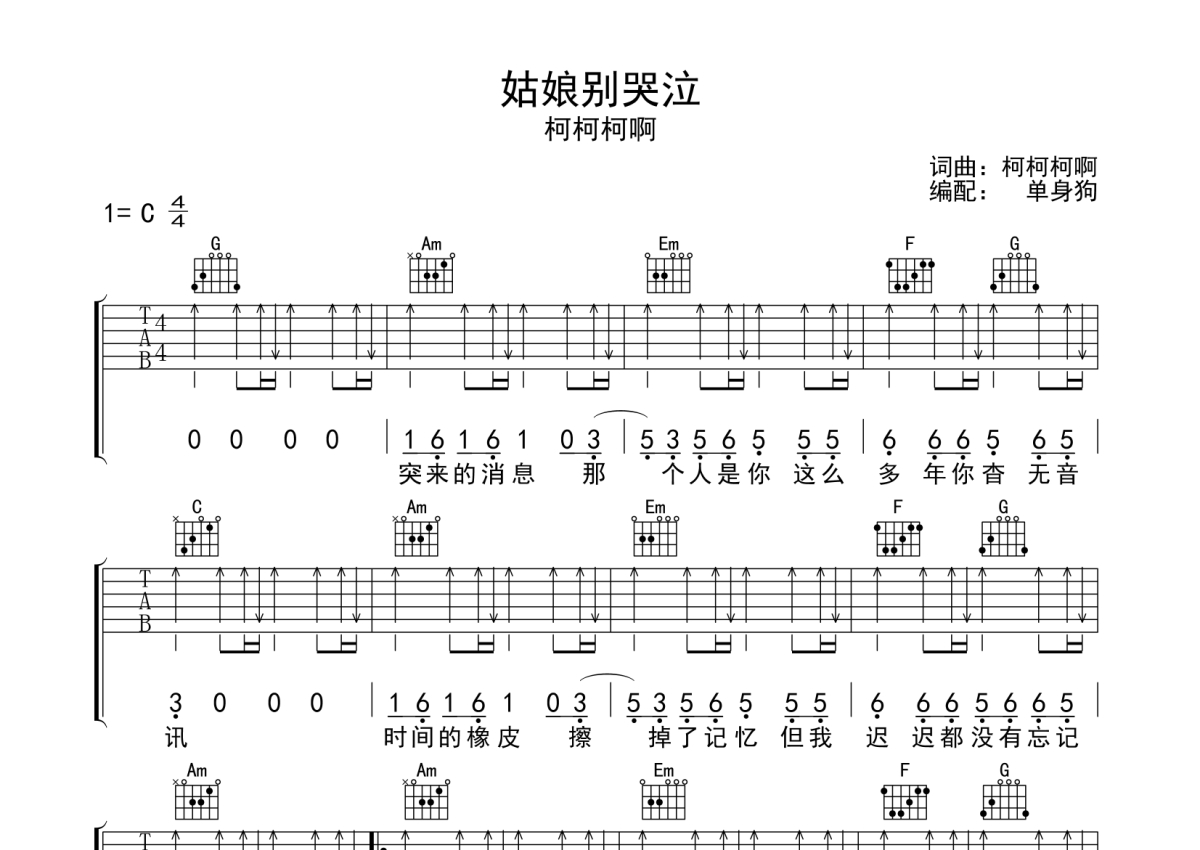 柯柯柯啊《姑娘别哭泣》吉他谱 - C调弹唱六线谱