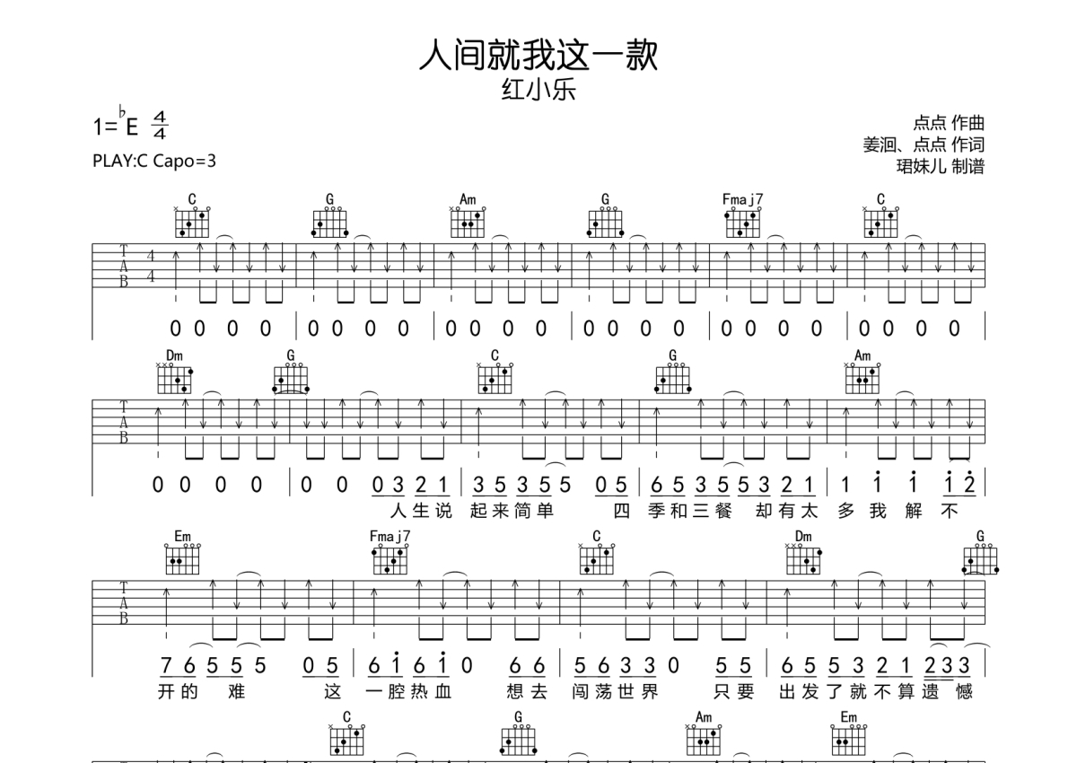 《人间就我这一款》是红小乐演唱的一首歌曲,拍号为4/4拍,歌曲速度为每分钟85拍,歌曲原调为C调,本吉他谱采用的是C调指法编配,变调夹3品弹奏即为原调,当然也可以根据自己的音域改变变调夹位置,或者通过改变和弦调性,以方便自己弹奏,这份吉他谱共有两张高清图谱,图谱由 @珺妹儿 编配上传,图谱使用六线谱编配,包含吉他和弦指法、简谱以及歌词部分,使用这份人间就我这一款吉他谱,可以让你更加方便地掌握这首歌曲的弹唱技巧,快来尝试吧。