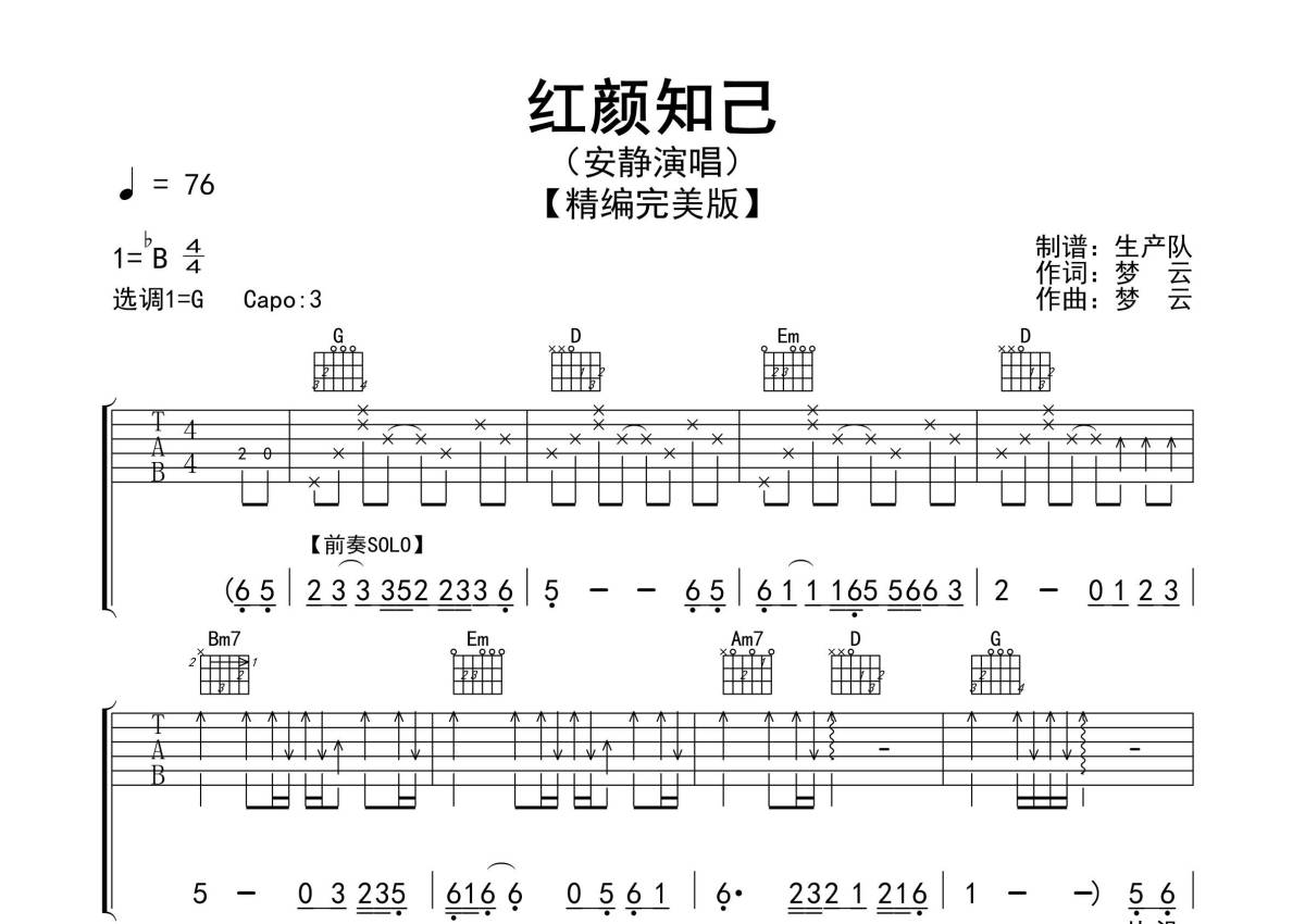 《红颜知己》是安静演唱的一首歌曲,精编完美版,拍号为4/4拍,歌曲速度为每分钟76拍,歌曲原调为Bb调,但由于原调指法比较难,为了方便弹奏,本吉他谱采用的是G调指法编配,变调夹3品弹奏即为原调,当然也可以根据自己的音域改变变调夹位置,或者通过改变和弦调性,以方便自己弹奏,这份吉他谱共有三张高清图谱,图谱由 @生产队 编配上传,图谱使用六线谱编配,包含吉他和弦指法、简谱以及歌词部分,使用这份红颜知己吉他谱,可以让你更加方便地掌握这首歌曲的弹唱技巧,快来尝试吧。本吉他谱根据安静演唱的《红颜知己》原版编配,采用G调指法,精准的前奏、间奏、尾奏及SOLO编配,一音不差版,值得推荐学习!。