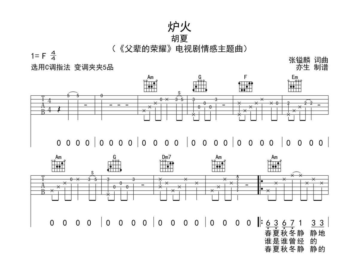 胡夏《炉火》吉他谱 - C调弹唱六线谱