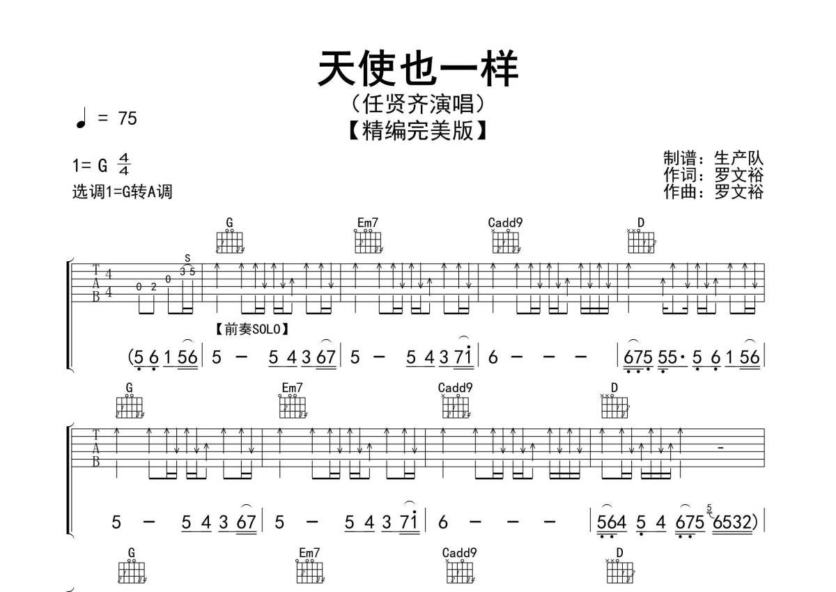 《天使也一样》是任贤齐演唱的一首歌曲,精编完美版,拍号为4/4拍,歌曲速度为每分钟75拍,歌曲原调为G调,本吉他谱采用的是G调指法编配,演奏时不需要使用变调夹即为原调,这份吉他谱共有三张高清图谱,图谱由 @生产队 编配上传,图谱使用六线谱编配,包含吉他和弦指法、简谱以及歌词部分,使用这份天使也一样吉他谱,可以让你更加方便地掌握这首歌曲的弹唱技巧,快来尝试吧。《天使也一样》是任贤齐演唱的歌曲,收录于专辑《天使兄弟小白脸》中。本吉他谱根据原版G转A调指法编配,精准的前奏、间奏、尾奏及SOLO编配,一音不差版,转调是本曲的亮点,需要重点关注,怀旧经典作品!。