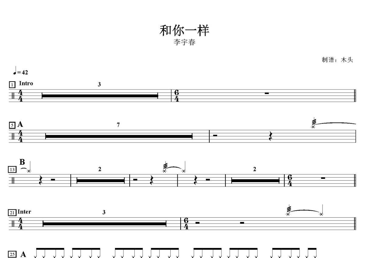 李宇春《和你一样》鼓谱 - 架子鼓谱