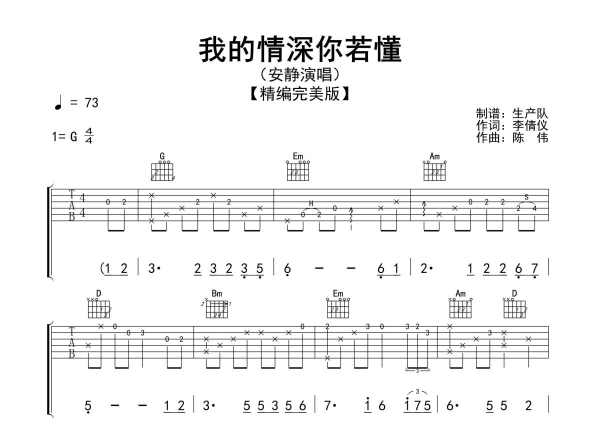 《我的情深你若懂》是安静演唱的一首歌曲,精编完美版,拍号为4/4拍,歌曲速度为每分钟73拍,歌曲原调为G调,本吉他谱采用的是G调指法编配,演奏时不需要使用变调夹即为原调,这份吉他谱共有三张高清图谱,图谱由 @生产队 编配上传,图谱使用六线谱编配,包含吉他和弦指法、简谱以及歌词部分,使用这份我的情深你若懂吉他谱,可以让你更加方便地掌握这首歌曲的弹唱技巧,快来尝试吧。《我的情深你若懂》是由安静王建荣演唱的一首歌曲,由李倩仪作词,陈伟作曲。本吉他谱根据原版G调指法编配,精准的前奏、间奏、尾奏及SOLO编配,一首深情动听的歌曲,值得推荐学习!。