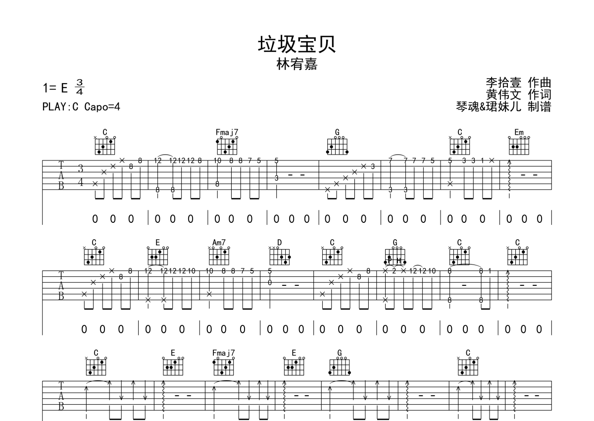 《垃圾宝贝》是林宥嘉演唱的一首歌曲,拍号为3/4拍,歌曲速度为每分钟85拍,歌曲原调为E调,但由于原调指法比较难,为了方便弹奏,本吉他谱采用的是C调指法编配,变调夹4品弹奏即为原调,当然也可以根据自己的音域改变变调夹位置,或者通过改变和弦调性,以方便自己弹奏,这份吉他谱共有四张高清图谱,图谱由 @珺妹儿 编配上传,图谱使用六线谱编配,包含吉他和弦指法、简谱以及歌词部分,使用这份垃圾宝贝吉他谱,可以让你更加方便地掌握这首歌曲的弹唱技巧,快来尝试吧。
