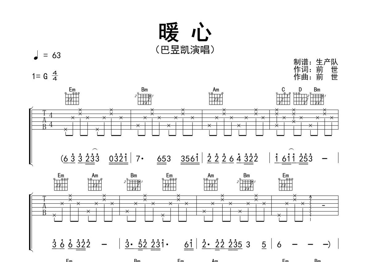 《暖心》是巴昱凯演唱的一首歌曲,精编完美版,拍号为4/4拍,歌曲速度为每分钟63拍,歌曲原调为G调,本吉他谱采用的是G调指法编配,演奏时不需要使用变调夹即为原调,这份吉他谱共有三张高清图谱,图谱由 @生产队 编配上传,图谱使用六线谱编配,包含吉他和弦指法、简谱以及歌词部分,使用这份暖心吉他谱,可以让你更加方便地掌握这首歌曲的弹唱技巧,快来尝试吧。《暖心》是由前世作词、作曲,巴昱凯深情演唱的一首歌曲,本吉他谱根据原版G调指法编配,精准的前奏、间奏、尾奏及SOLO编配,一音不差版,值得推荐的作品!。