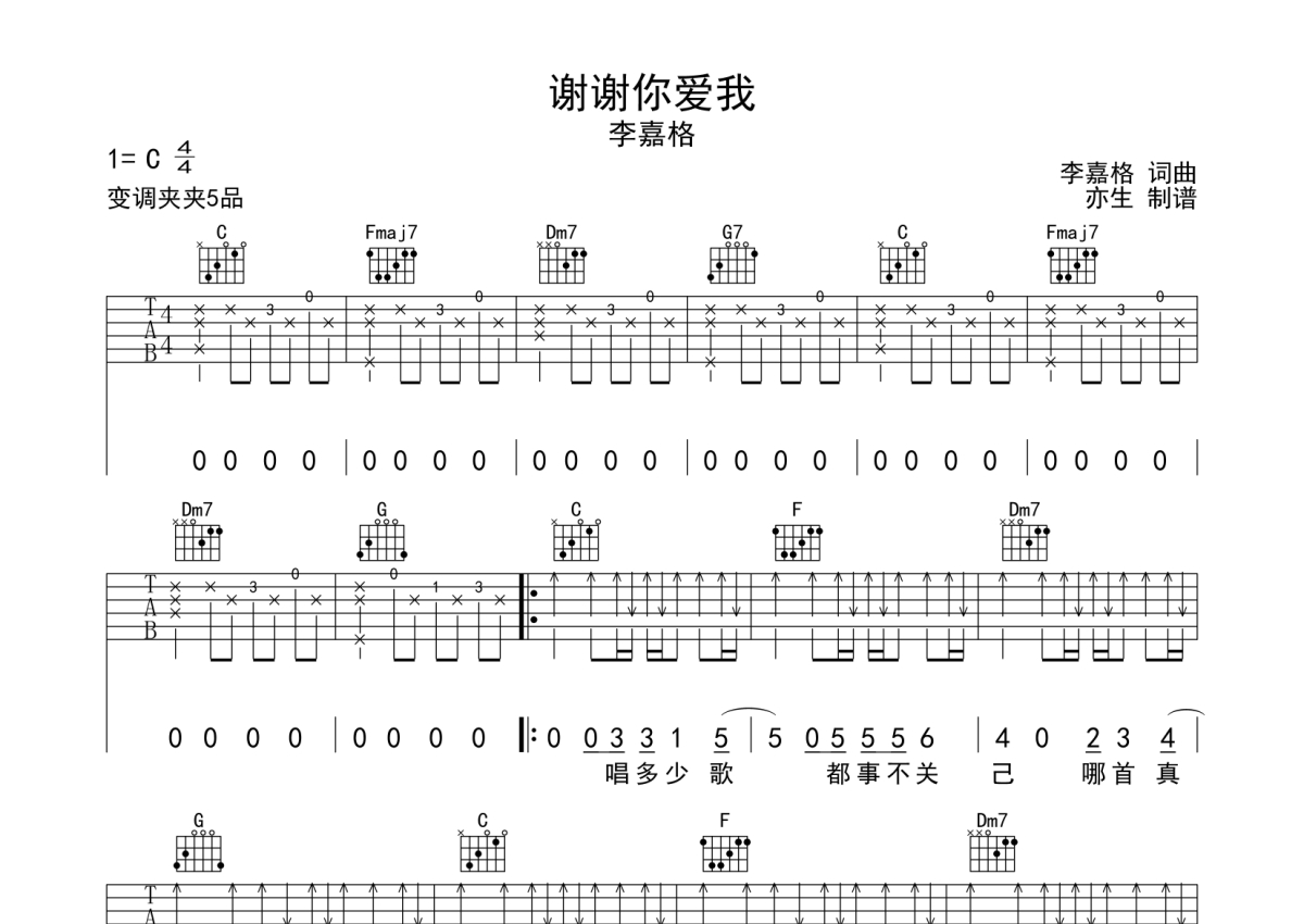 《谢谢你爱我》是李嘉格演唱的一首歌曲,拍号为4/4拍,歌曲原调为F调,但由于原调指法比较难,为了方便弹奏,本吉他谱采用的是C调指法编配,变调夹5品弹奏即为原调,当然也可以根据自己的音域改变变调夹位置,或者通过改变和弦调性,以方便自己弹奏,这份吉他谱共有三张高清图谱,图谱由 @亦生 编配上传,图谱使用六线谱编配,包含吉他和弦指法、简谱以及歌词部分,使用这份谢谢你爱我吉他谱,可以让你更加方便地掌握这首歌曲的弹唱技巧,快来尝试吧。