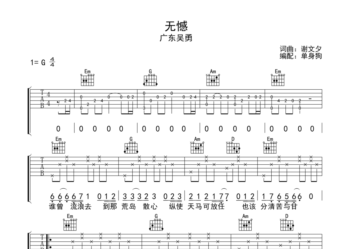 广东吴勇《无憾》吉他谱 - G调弹唱六线谱