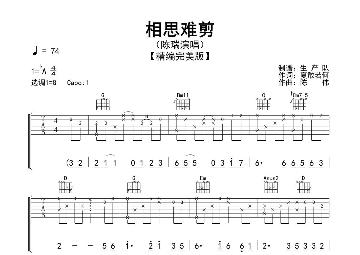 《相思难剪》是陈瑞演唱的一首歌曲,精编完美版,拍号为4/4拍,歌曲速度为每分钟74拍,歌曲原调为Ab调,但由于原调指法比较难,为了方便弹奏,本吉他谱采用的是G调指法编配,变调夹1品弹奏即为原调,当然也可以根据自己的音域改变变调夹位置,或者通过改变和弦调性,以方便自己弹奏,这份吉他谱共有三张高清图谱,图谱由 @生产队 编配上传,图谱使用六线谱编配,包含吉他和弦指法、简谱以及歌词部分,使用这份相思难剪吉他谱,可以让你更加方便地掌握这首歌曲的弹唱技巧,快来尝试吧。《相思难剪》是陈瑞演唱的歌曲,收录于《相思难剪》的专辑中,由夏敢若何填词、陈伟作曲。本吉他谱根据原版采用G调指法编配,精准的前奏、间奏、尾奏及SOLO编配,一音不差版,值得推荐学习!。