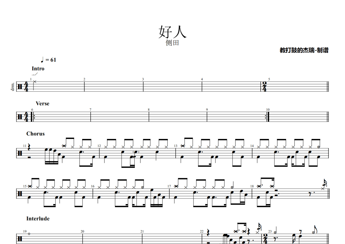 《好人》是侧田演唱的一首歌曲,拍号为4/4拍,歌曲速度为每分钟61拍,这份鼓谱共有两张高清图谱,图谱由 @Jerry 编配上传,图谱使用五线谱编配,使用这份好人架子鼓谱,你将能够轻松地敲打出这首侧田的好人,快来尝试吧。