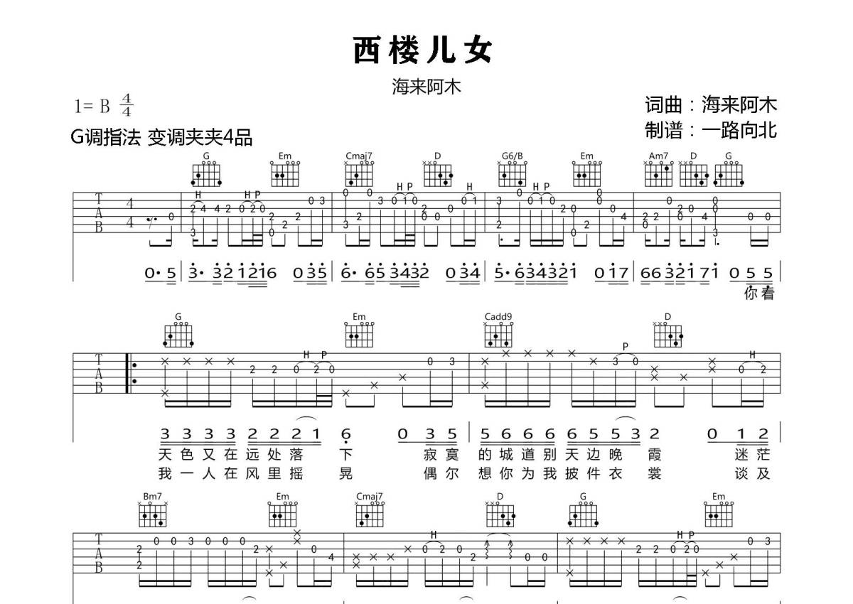 《西楼儿女》是海来阿木演唱的一首歌曲,拍号为4/4拍,歌曲原调为B调,但由于原调指法比较难,为了方便弹奏,本吉他谱采用的是G调指法编配,变调夹4品弹奏即为原调,当然也可以根据自己的音域改变变调夹位置,或者通过改变和弦调性,以方便自己弹奏,这份吉他谱共有三张高清图谱,图谱由 @圆创吉他谱 编配上传,图谱使用六线谱编配,使用这份西楼儿女吉他谱,可以让你更加方便地掌握这首歌曲的演奏技巧,快来尝试吧。