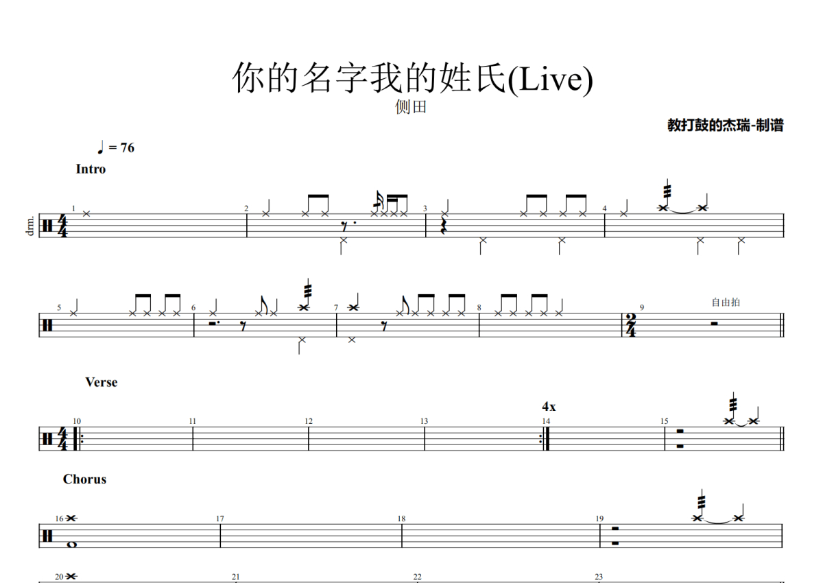 侧田《你的名字我的姓氏》鼓谱 - 架子鼓谱 - live