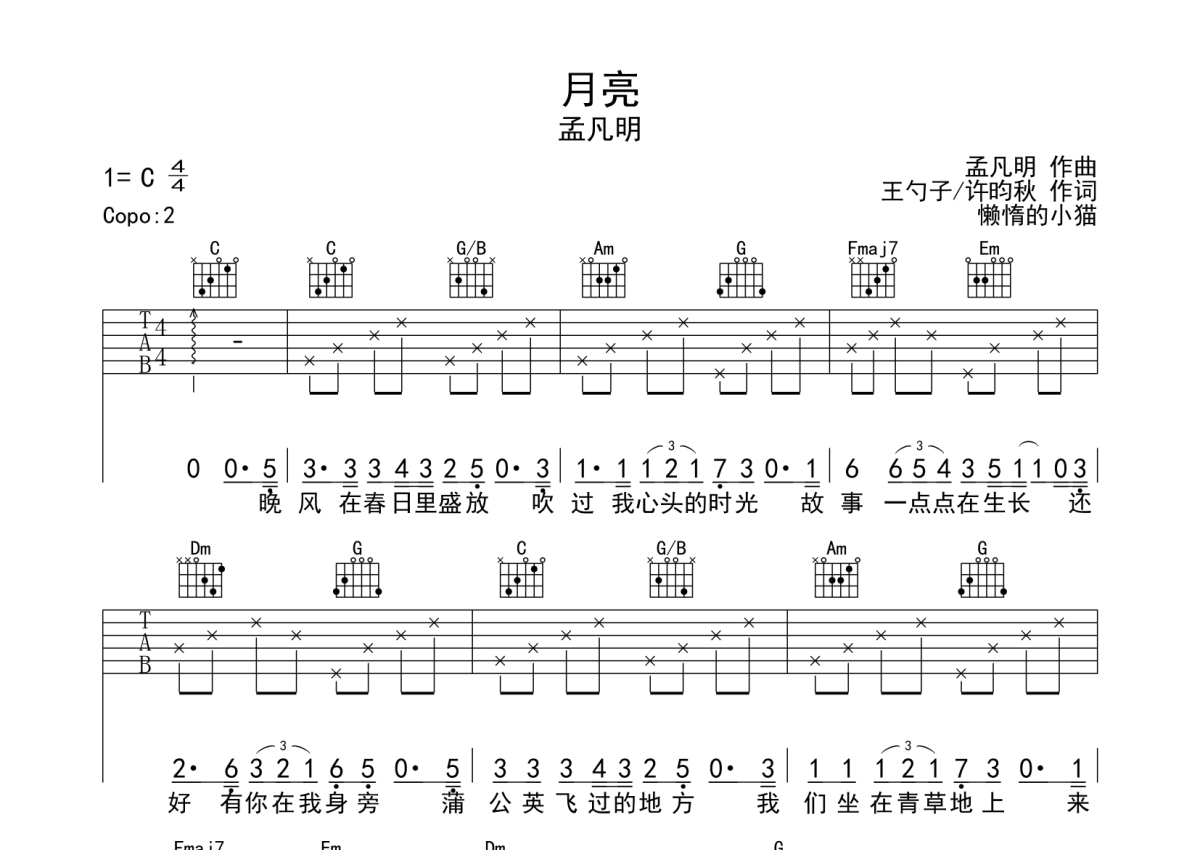 孟凡明《月亮》吉他谱 - C调弹唱六线谱