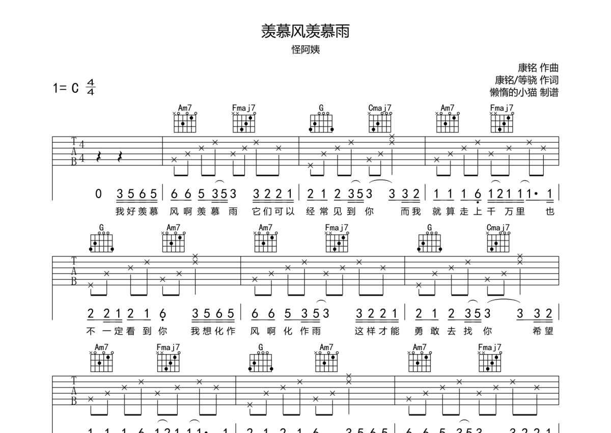 怪阿姨《羡慕风羡慕雨》吉他谱 - C调弹唱六线谱