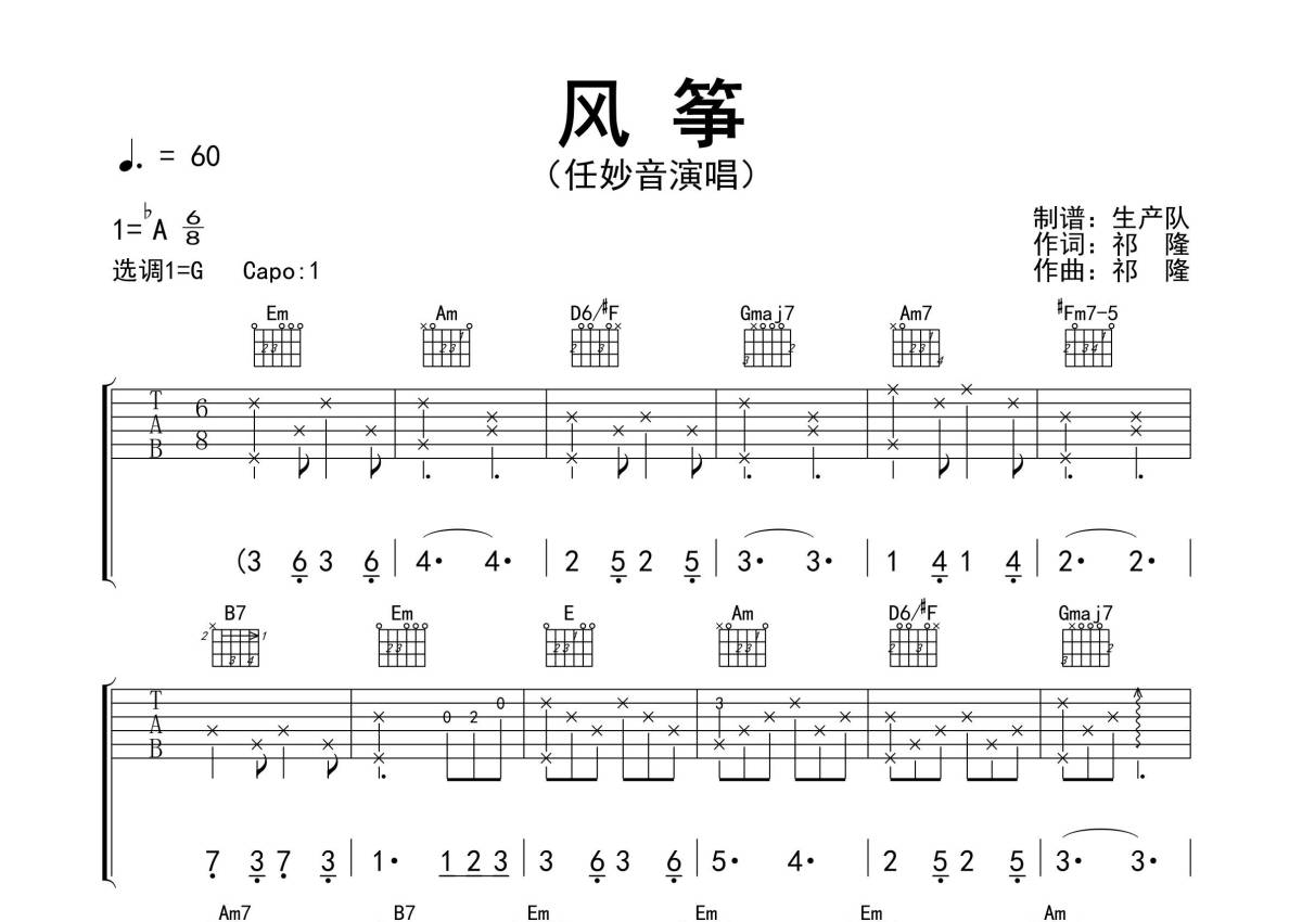 《风筝》是任妙音演唱的一首歌曲,精编完美版,拍号为6/8拍,歌曲速度为每分钟60拍,歌曲原调为Ab调,但由于原调指法比较难,为了方便弹奏,本吉他谱采用的是G调指法编配,变调夹1品弹奏即为原调,当然也可以根据自己的音域改变变调夹位置,或者通过改变和弦调性,以方便自己弹奏,这份吉他谱共有三张高清图谱,图谱由 @生产队 编配上传,图谱使用六线谱编配,包含吉他和弦指法、简谱以及歌词部分,使用这份风筝吉他谱,可以让你更加方便地掌握这首歌曲的弹唱技巧,快来尝试吧。《风筝》是歌手任妙音演唱的歌曲,祁隆、栀子无花作词,祁隆、潘信燃作曲,北京隆娱文化发行。本吉他谱根据原版采用C调指法编配,完整的前奏、间奏、尾奏编配,是一首深情温暖的民谣歌曲。