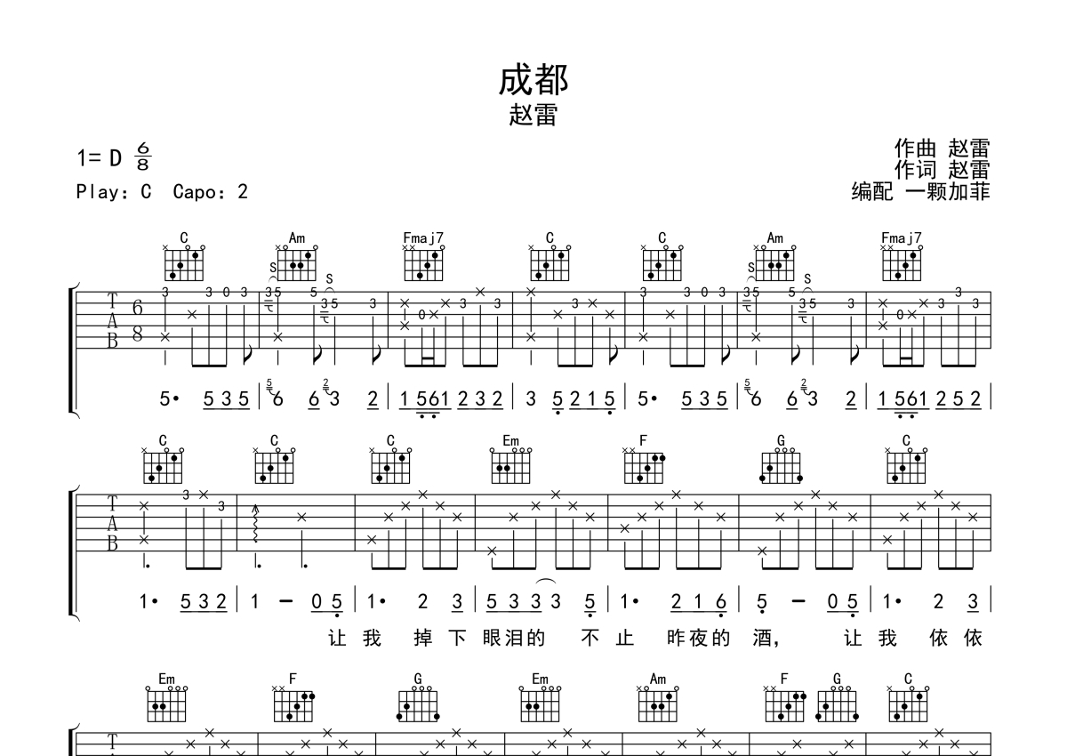赵雷《成都》吉他谱 - C调弹唱六线谱