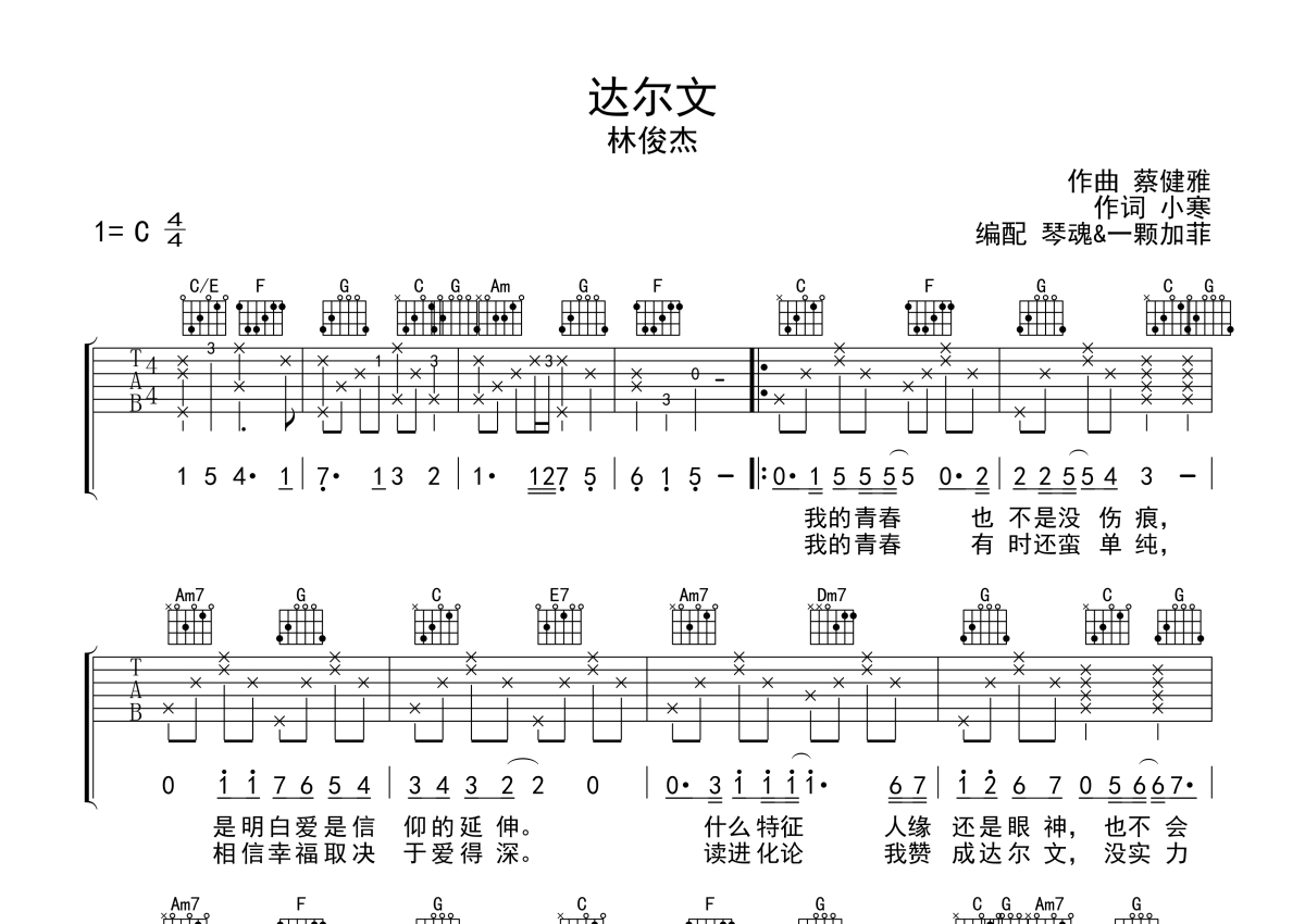 林俊杰《达尔文》吉他谱 - C调弹唱六线谱