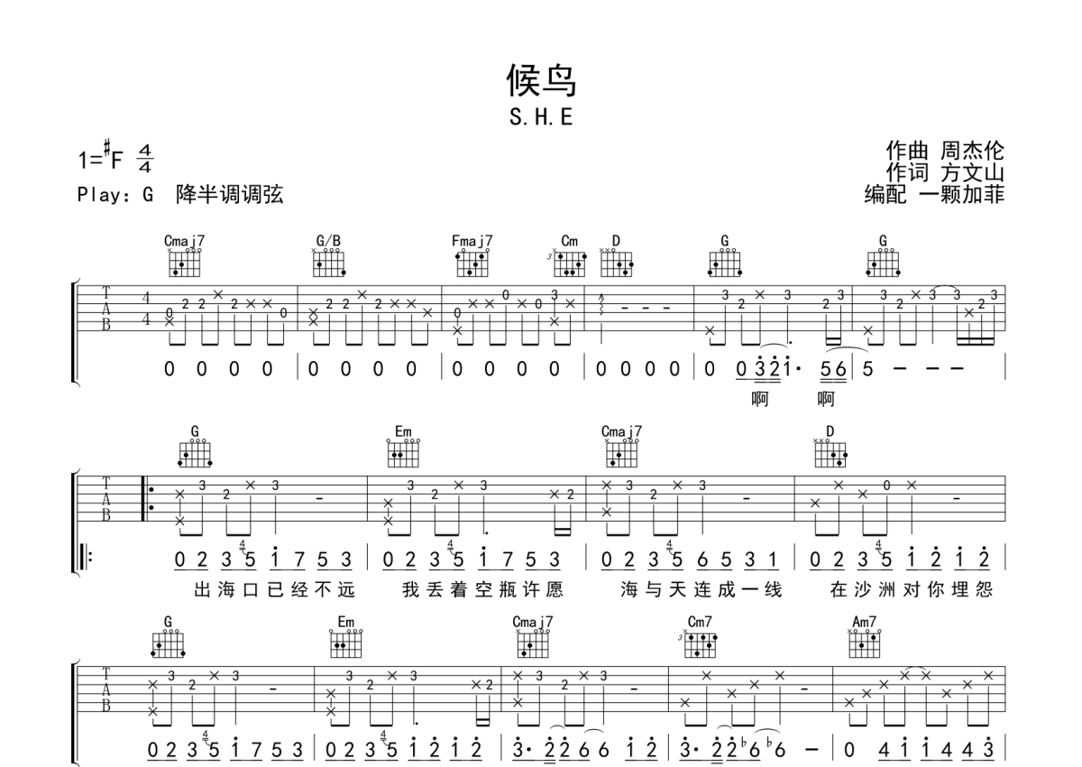 《候鸟》是SHE演唱的一首歌曲,拍号为4/4拍,歌曲原调为Gb调,但由于原调指法比较难,为了方便弹奏,本吉他谱采用的是G调指法编配,降半音调弦弹奏即为原调,当然也可以根据自己的音域决定是否调弦,这份吉他谱共有两张高清图谱,图谱由 @一颗加菲 编配上传,图谱使用六线谱编配,包含吉他和弦指法、简谱以及歌词部分,曲谱配备了相关的音频提供试听,使用这份候鸟吉他谱,可以让你更加方便地掌握这首歌曲的弹唱技巧,快来尝试吧。