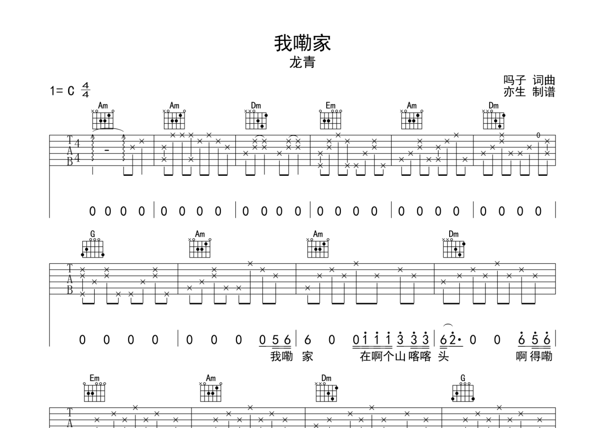 龙青《我嘞家》吉他谱 - C调弹唱六线谱