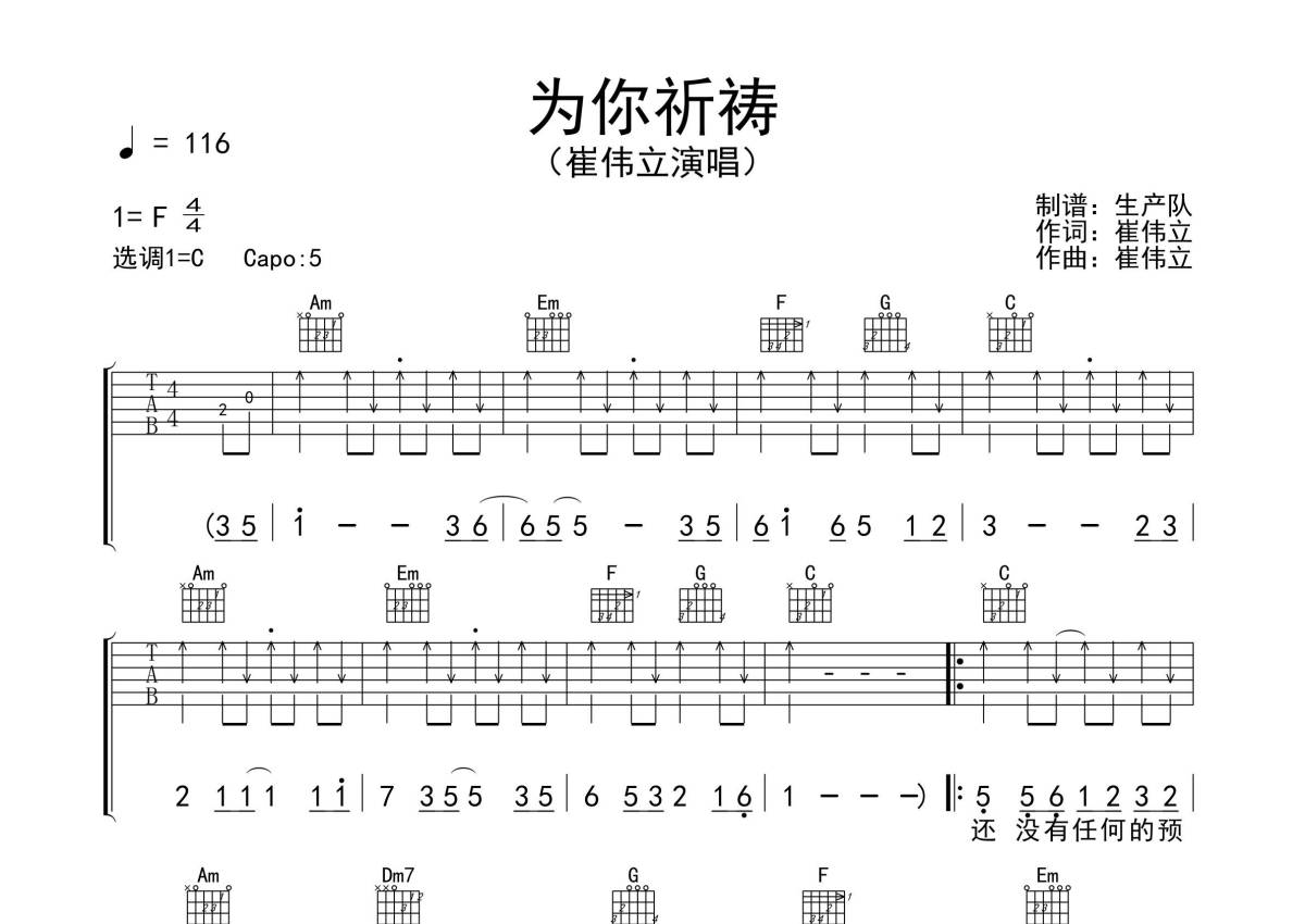 《为你祈祷》是崔伟立演唱的一首歌曲,精编扫弦版,拍号为4/4拍,歌曲速度为每分钟116拍,歌曲原调为F调,但由于原调指法比较难,为了方便弹奏,本吉他谱采用的是C调指法编配,变调夹5品弹奏即为原调,当然也可以根据自己的音域改变变调夹位置,或者通过改变和弦调性,以方便自己弹奏,这份吉他谱共有三张高清图谱,图谱由 @生产队 编配上传,图谱使用六线谱编配,包含吉他和弦指法、简谱以及歌词部分,使用这份为你祈祷吉他谱,可以让你更加方便地掌握这首歌曲的弹唱技巧,快来尝试吧。《为你祈祷》是由崔伟立填词、谱曲并演唱的歌曲,收录在专辑《为你祈祷》中。本吉他谱根据原版采用C调指法编配,精准的前奏、间奏、尾奏及SOLO,扫弦节奏编配,一首深情动听的民谣歌曲,值得推荐!。